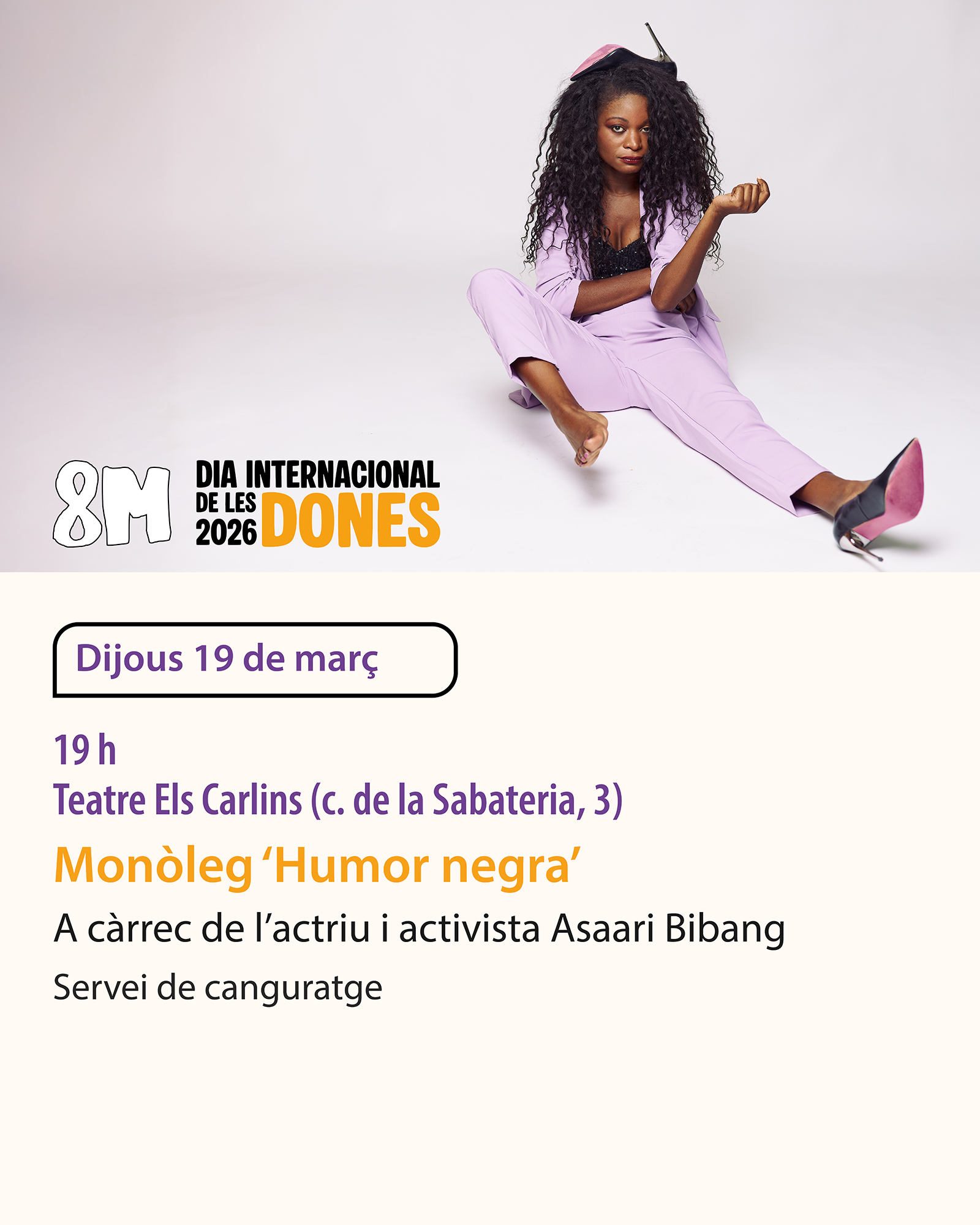 Lloc : Teatre Els CarlinsA càrrec d’Asaari Bibang, influencer, actriu i creadora de contingut a les xarxes socials, que combina humor crític i compromís social. Sessió oberta i gratuïta Servei de canguratge reservant abans del 17 de març al 93 875 23 10 o siad@ajmanresa.cat. -