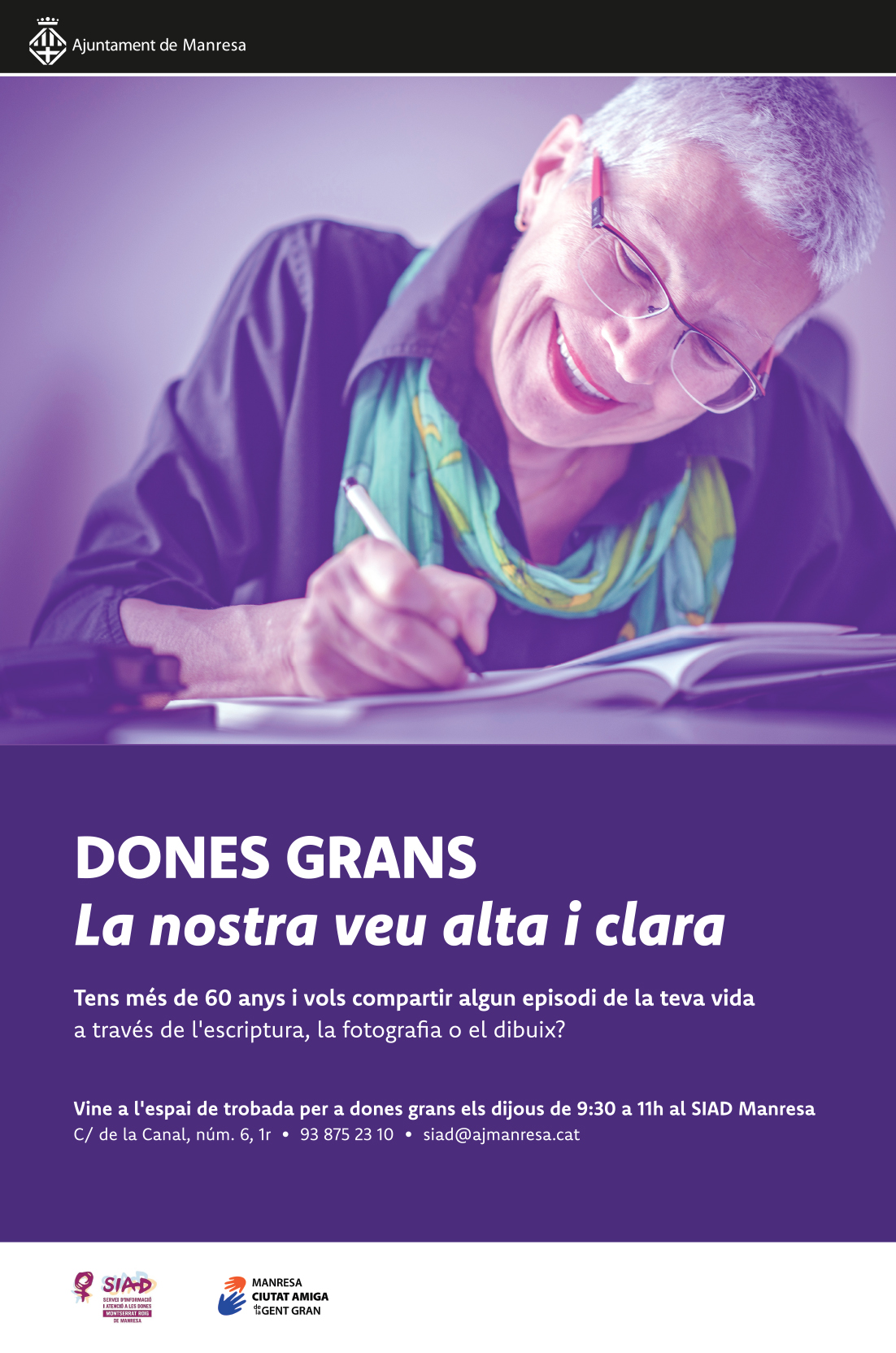 Durant el maig i juny del 2022 el SIAD i el Programa de Persones Grans de l’Ajuntament de Manresa, a través de la demanda d’un grup de dones grans de la ciutat, es va organitzar un taller d’escriptura terapèutica de tres sessions al centre Cultural del Casino amb l’objectiu de reforçar la salut emocional i el desenvolupament personal a través de l’escriptura amb el suport i l’acompanyament d’una psicòloga especialista.