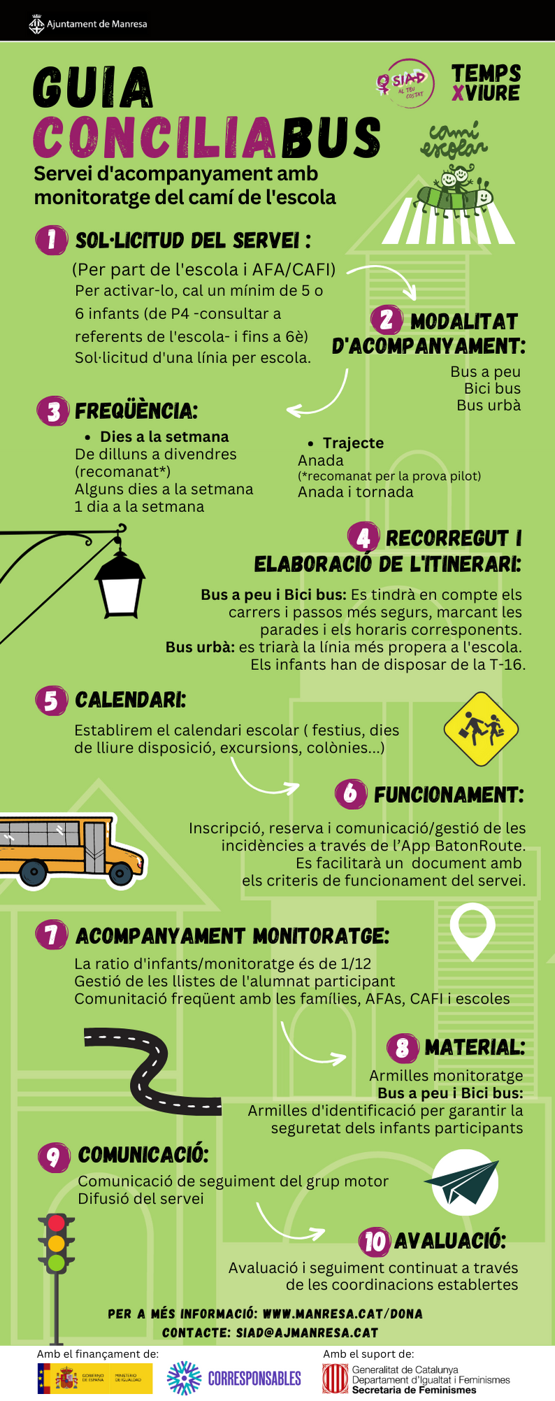 El servei Conciliabus, és un servei amb monitoratge que acompanya els infants a l’escola (modalitat bus a peu, bicibús i bus urbà) . És una bona pràctica que s’ha de valorar des d'una dimensió temporal, de cura i de sostenibilitat ja que contribueix a afavorir la conciliació i l’equitat en els temps quotidians i avançar cap a un model de mobilitat sostenible a la ciutat de Manresa.