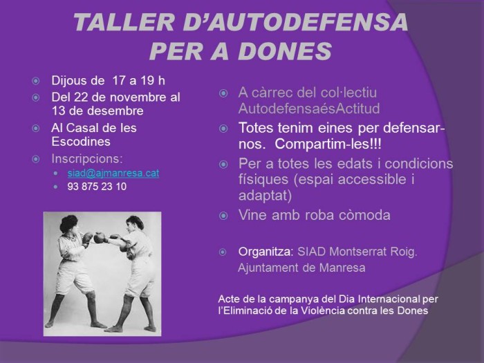 El Servei d’Informació i Atenció a la Dona (SIAD) Montserrat Roig de l’Ajuntament de Manresa realitzarà la tercera edició del taller d’autodefensa per a dones, una activitat que s’emmarca dins del programa d’actes de la campanya pel Dia Internacional per l’Eliminació de la Violència contra les Dones.
