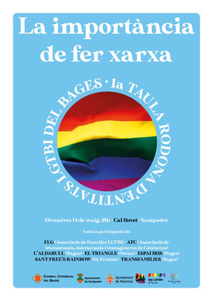 En el marc dels actes per commemorar la jornada del 17 de maig, Dia Internacional contra la LGTBIfòbia, es planteja la trobada La importància de fer xarxa que donarà a conèixer les entitats del Bages en relació amb aquesta temàtica i comptarà amb set col·lectius LGTBI+ de la comarca. Les entitats participants seran FLG (Famílies de Gais i Lesbianes), ATC Llibertat (Associació de transsexuals, intersexuals i transgèneres de Catalunya), l’Aldarull (Manresa), el Triangle (Navàs), l’Espai Iris (Bages), SantFree’s Rainbow (Sant Fruitós de Bages) i Transfamílies (Bages).