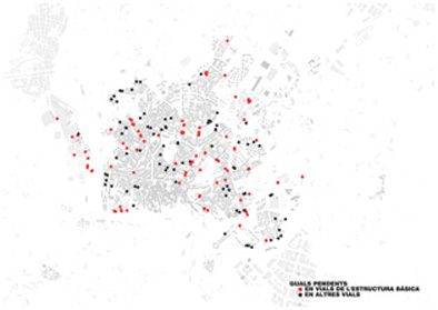 D'altra banda, un dels aspectes també decisius en la millora de l'espai públic el constitueix assolir, a la ciutat, uns recorreguts adaptats en la qual cosa hi contribueixen primordialment l'existència o no de guals de vianants. Com a complement de l'auditoria, en els darrers mesos s'ha procedit a realitzar un inventari exhaustiu d'aquests elements, del qual se'n desprèn que el 25% dels passos de vianants encara no estan adaptats. També l'actuació municipal durant l'any 2017 s'ha centrat en aquest àmbit i s'han construït sis nous guals. La distribució dels guals de vianants pendents és la que es descriu en la imatge que segueix a continuació.