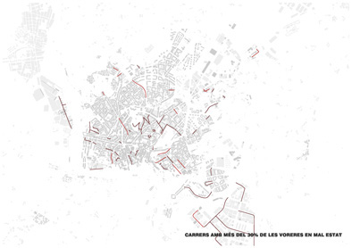 En aquest sentit, el document estableix que 162 carrers de la ciutat tenen més del 30% de la seva calçada en mal estat, mentre que estableix que 77 carrers tenen més del 30% de la superfície de les voreres en un estat inadequat. La distribució geogràfica dels carrers amb calçades i voreres en més mal estat és la que es descriu en els gràfics que segueixen a continuació i en les taules de carrers amb més del 30% de les calçades en mal estat i carrers amb més del 30% de les voreres en mal estat.