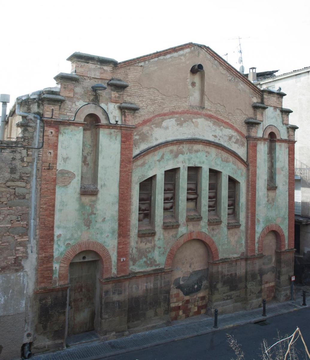 El cos central té una altra porta tapiada més ampla que les altres i a sobre un finestral amb arc rebaixat compost de cinc finestres amb tancaments de fusta simulats. A sobre del finestral hi ha marcades dues línies amb la mateixa forma d'arc rebaixat, la superior de les quals delimita el cos central i la zona pintada A la part del frontó hi ha una altra finestra cega amb arc de mig punt sense emmarcaments. El mur està arrebossat i pintat de color verd clar, en contrast amb el maó vermell, amb l'excepció del sòcol, alt i revestit amb carreus de pedra arenosa, i del frontó, arrebossat sense pintar. El ritme i la composició de les obertures així com el cromatisme de la façana estan tractats com una escenografia, com a símbol de la funció de l'edifici.