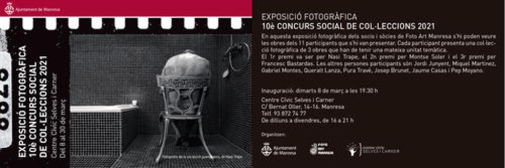 Dins la línia expositiva fotogràfica del centre cívic Selves i Carner (C/ Bernat Oller, 14-16) i amb col·laboració amb Foto Art Manresa, fins al 30 de març es pot visitar l’exposició de les fotografies presentades al 10è concurs social de col·leccions 2021, de la mateixa entitat.