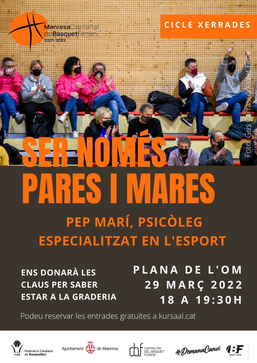 18/03/2022La programació del cicle de xerrades de l’eix “Més enllà del bàsquet”, dins dels actes de Manresa, Capital del Bàsquet Femení, continuarà el dimarts 29 de març, a les 18 hores, a la sala de la Plana de l’Om, amb una conferència de psicologia esportiva sota el títol “Ser només pares i mares”. La xerrada, a càrrec del psicòleg esportiu Pep Marí, donarà les claus per saber estar a la grada.