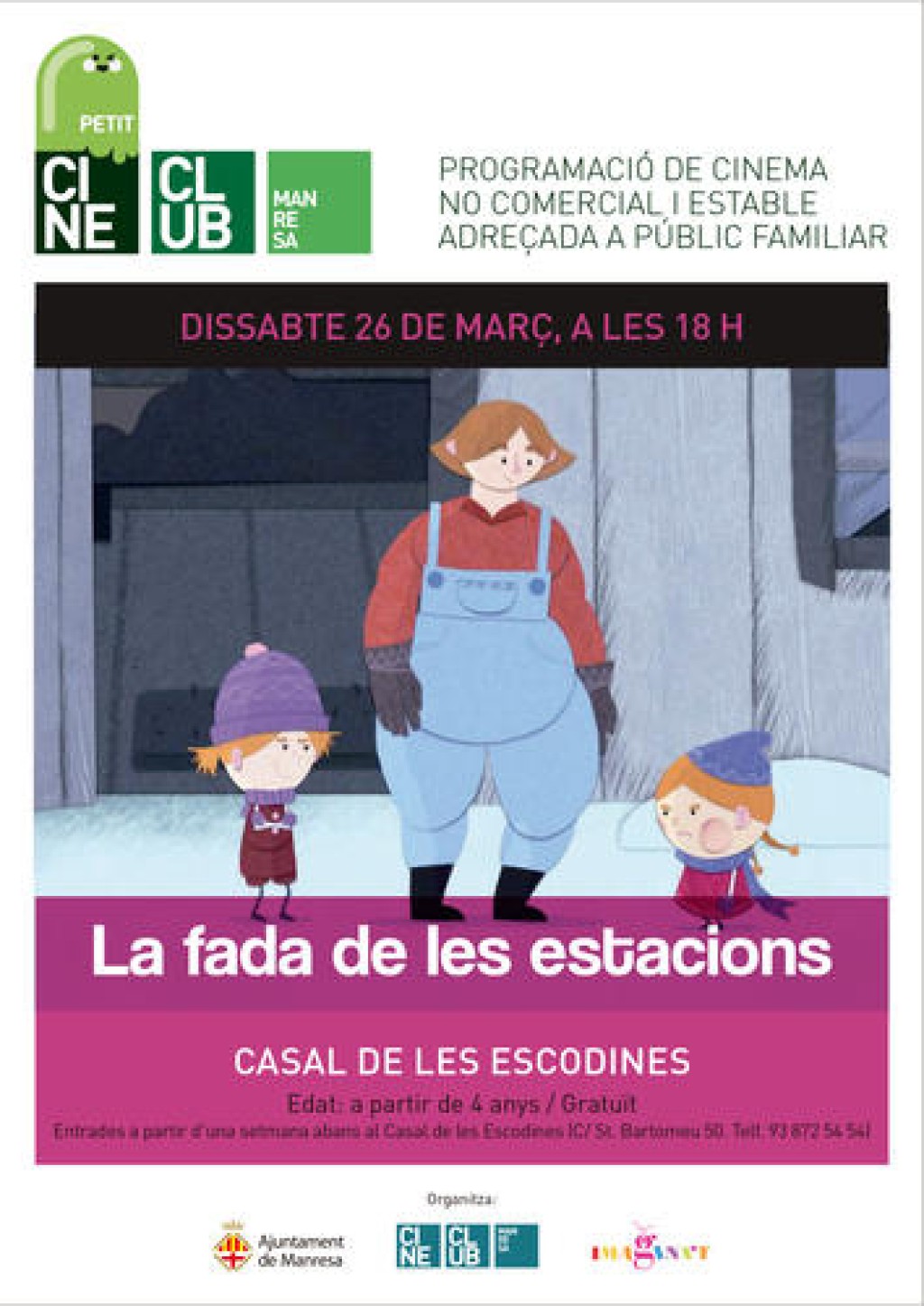 23/03/2022Aquest dissabte 26 de març a les 18 h al Casal de les Escodines es projectarà “La fada de les estacions” per a infants a partir de 4 anys. Les entrades gratuïtes es poden adquirir anticipadament al Casal de les Escodines (C/ St. Bartomeu, 50; Telèfon 938725454, de 9 a 14 h i de 16 a 20.30 h i el dissabte de 10 a 14 h i abans de la projecció.