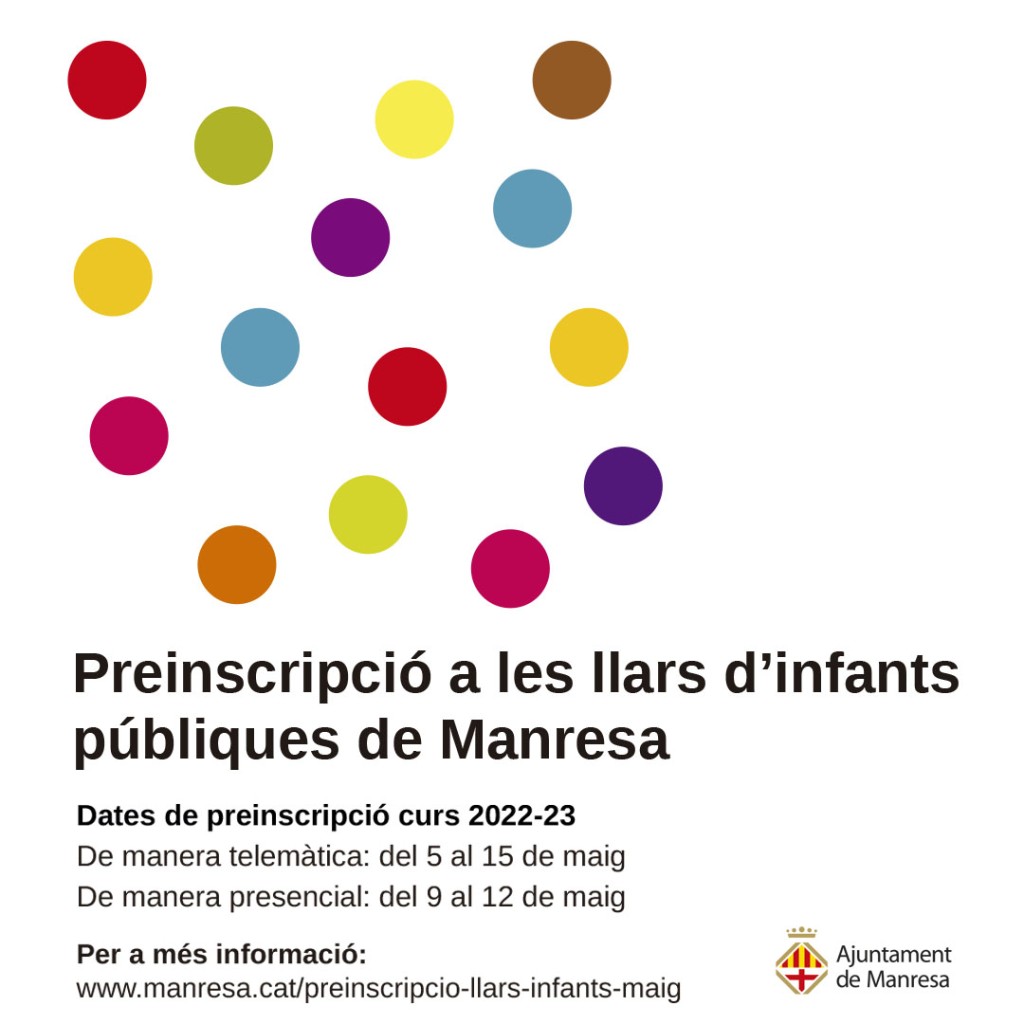 Manresa disposa de 8 llars d’infants públiques: 5 llars d’infants municipals (L’Estel, La Lluna, Petit Príncep, La Llum i Bressolvent) i 3 llars d’infants de la Generalitat de Catalunya (Picarol, Espurna i Ginesta). A partir d’aquest dijous, 21 d’abril, comencen les jornades de portes obertes, que serveixen perquè les famílies interessades coneguin el projecte educatiu, els serveis i les instal·lacions de cadascuna d’elles.
