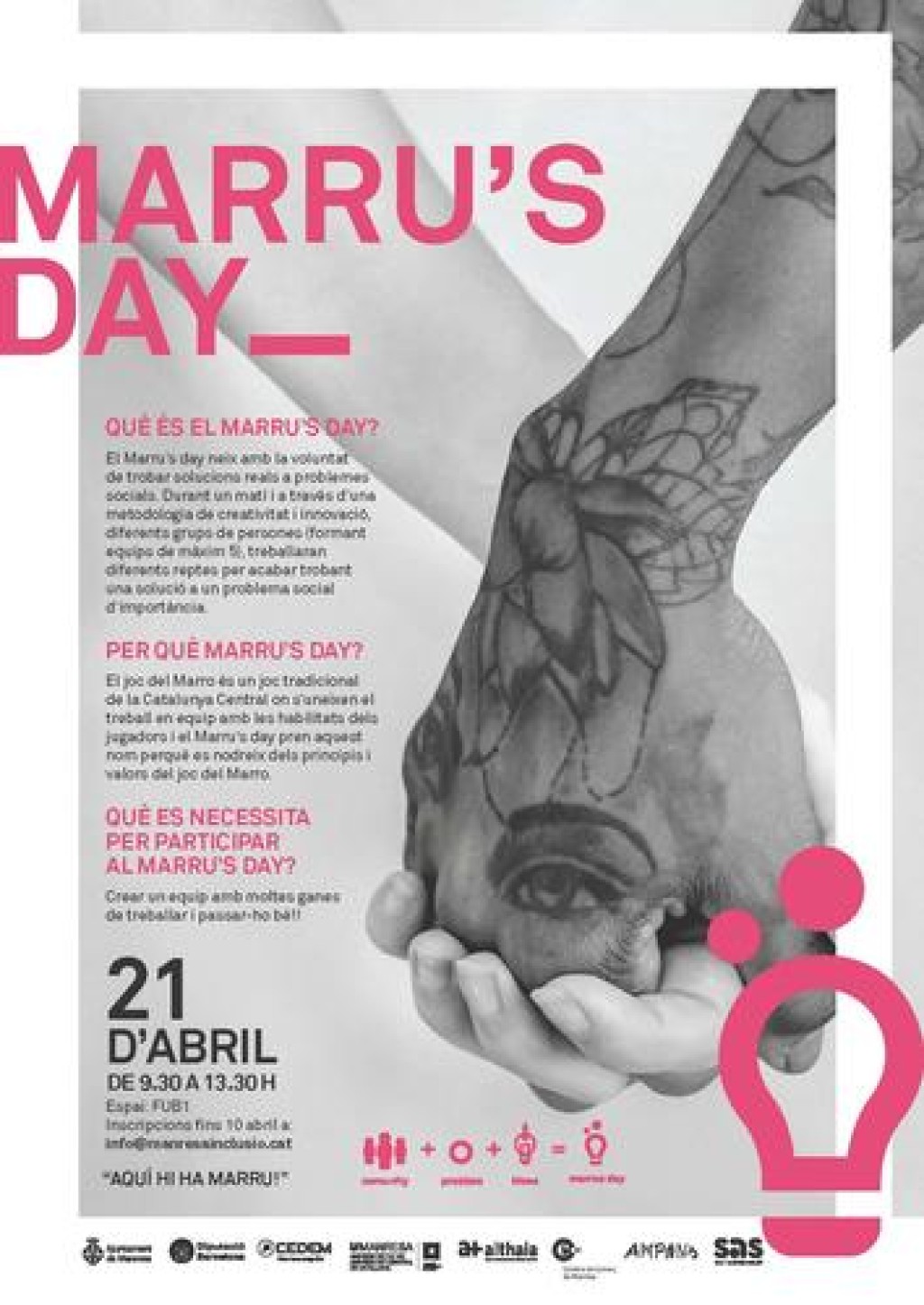 El Marru’s day neix amb la voluntat de trobar solucions reals a problemes socials. Durant un matí i a través d’una metodologia de creativitat i innovació, diferents grups de persones (formant equips de màxim 5), treballaran diferents reptes per acabar trobant una solució a un problema social d’importància.