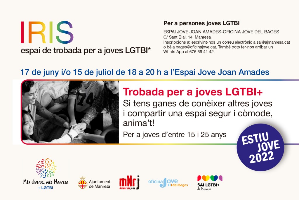 L’Espai Iris està organitzat pel Servei d’Atenció Integral (SAI) LGTBI de l’Ajuntament de Manresa i per l’Oficina Jove del Bages. Hi poden participar joves LGTBI+ de la comarca, d’entre 14 i 25 anys, que tinguin ganes de generar xarxa i compartir experiències. L’Iris pretén ser un espai d’interacció i de trobada lliure. Enguany, a més, comptarà amb una persona dinamitzadora per tal de generar dinàmiques de coneixença entre els participants i resoldre dubtes que es puguin plantejar al voltant de les diversitats afectives, sexuals i de gènere.
