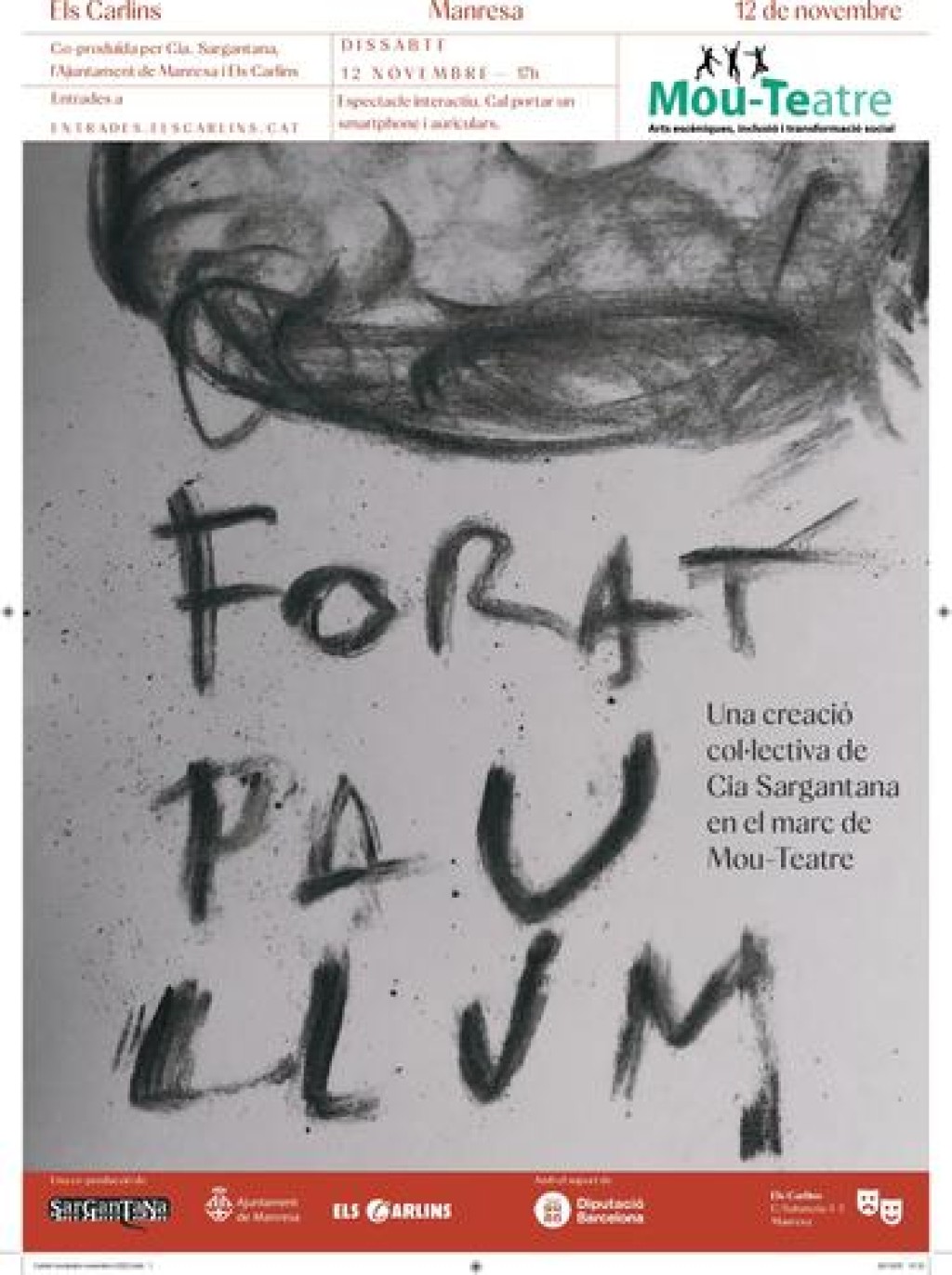 L’obra de teatre “Forat, Pau, Llum” és interactiva i cal que les persones assistents portin un smartphone amb auriculars, ja que es fa un recorregut per diferents espais del teatre. Es destaca una metodologia que ens vol treure de ser només espectadors i passem a ser cocreadors de la posada en escena. Es poden reservar les entrades a l’enllaç Entrades.Elscarlins.Cat