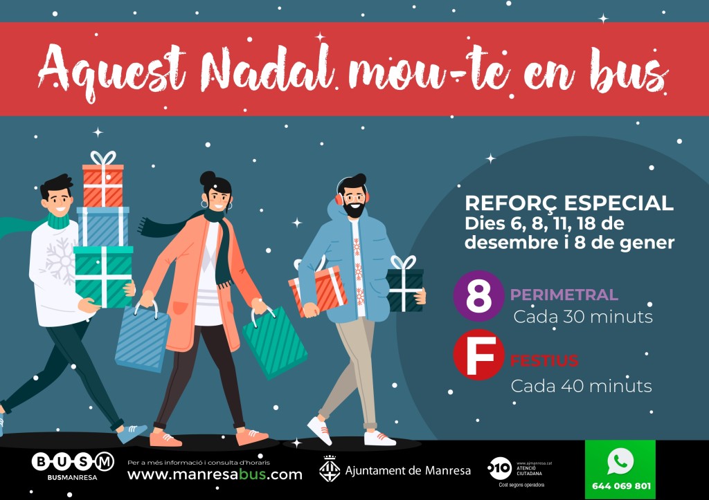 Amb l'objectiu de facilitar els desplaçaments des dels barris a les zones comercials de la ciutat amb transport públic urbà, els dies 6, 8, 11, 18 de desembre, i 8 de gener, dies festius d'obertura del comerç, el servei Bus Manresa reforçarà la línia 8 Perimetral, que els festius té freqüències de pas de 60 minuts, amb freqüències cada 30 minuts; la Línia F (Festius), des de l’estiu en que es va reforçar de forma permanent el servei té freqüències de 40 minuts.