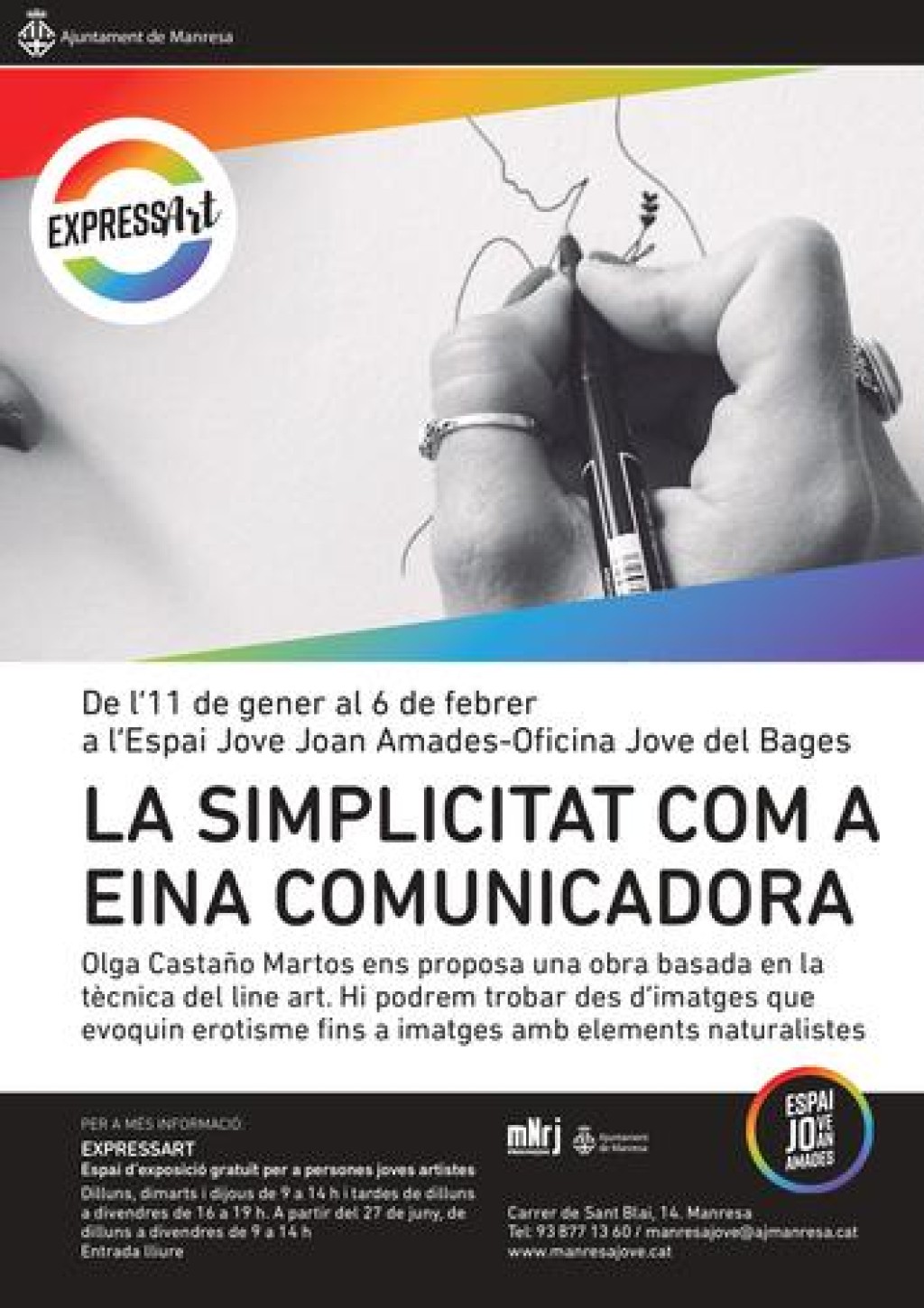 L’Espai Jove Joan Amades acollirà a partir de demà dimecres, 11 de gener, i fins al 6 de febrer, l’exposició “La simplicitat com a eina comunicadora”, de la jove artista Olga Castaño Martos. La mostra es podrà veure a ExpressArt, un espai expositiu per a diverses disciplines artístiques amb la intenció de servir de plataforma per al jovent des d’on donar-se a conèixer al públic.