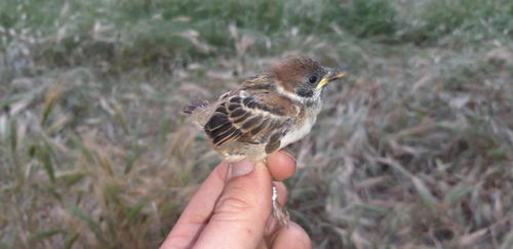 (*) Fotografia: Exemplar de pollet de pardal xarrec d’uns 10-15 dies d’edat, anellat al Parc del Cardener.