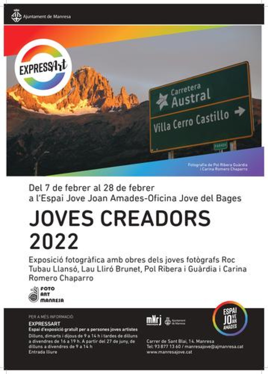 Quatre joves fotògrafs manresans exposen a partir d’avui les seves obres a l’Espai Jove Joan Amades en el marc del cicle “Joves Creadors 2022”, organitzat conjuntament per Foto Art Manresa i la regidoria de Cultura de l’Ajuntament de Manresa. L’exposició es podrà visitar fins al 28 de febrer, els dilluns, dimarts i dijous de 9 a 14, i de dilluns a divendres de 16 a 19 h.