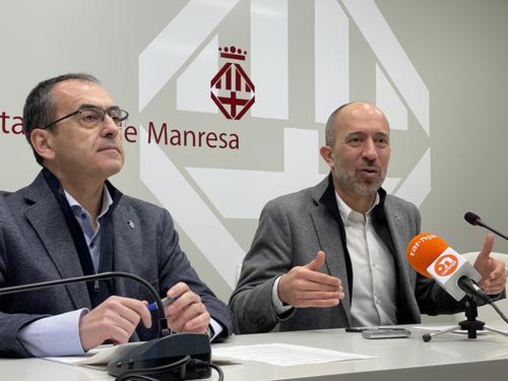 (*) El regidor Josep Gili Prat i l'alcalde de Manresa, Marc Aloy Guàrdia, durant la roda de premsa.