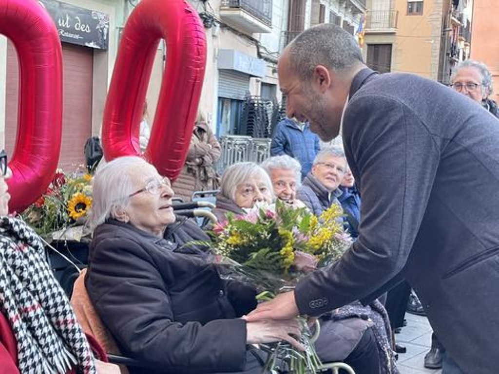 15/02/2023L’alcalde de Manresa, Marc Aloy Guàrdia, li va lliurar ahir un obsequi i un ram de flors en nom del consistori. L’acte es va celebrar a la plaça Major, on Carme Boix havia residit durant 70 anys. La seva família li va preparar una gran festa sorpresa, amb berenar i ballada de sardanes, que va aplegar desenes de persones, entre familiars, veïns i amics.