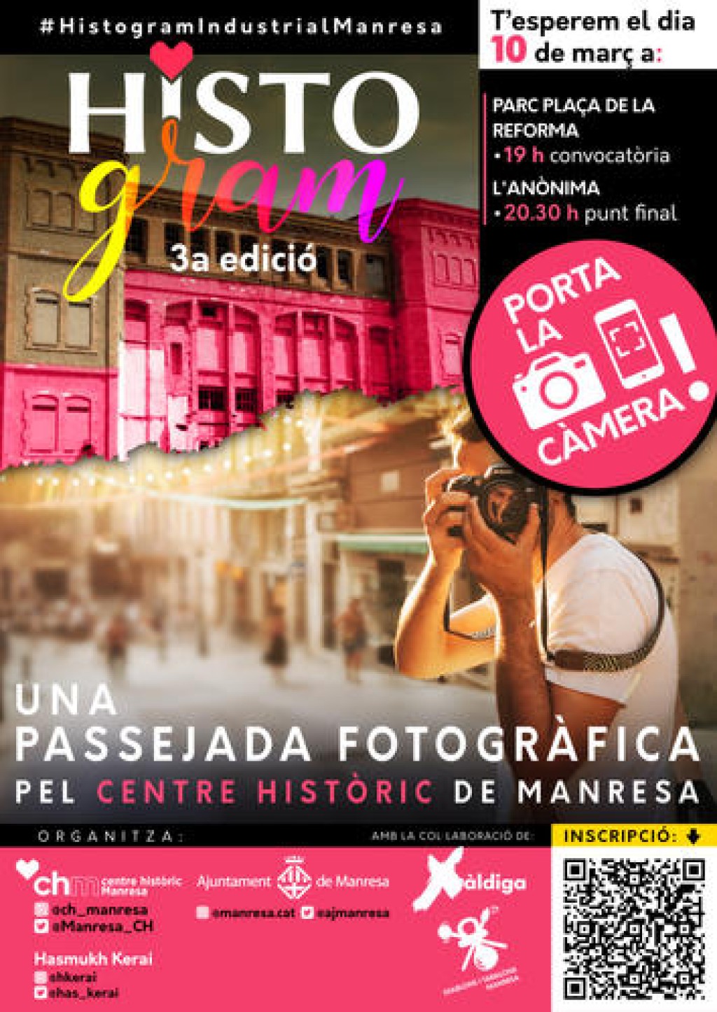 Amb l’objectiu de dinamitzar i donar valor als carrers i el patrimoni arquitectònic i industrial del nucli antic de Manresa, l’Ajuntament, a través de la regidoria de Centre Històric, organitza el pròxim 10 de març, de les 19 a les 20.30 h, la 3a edició d’Histogram, una passejada fotogràfica pel Centre Històric.