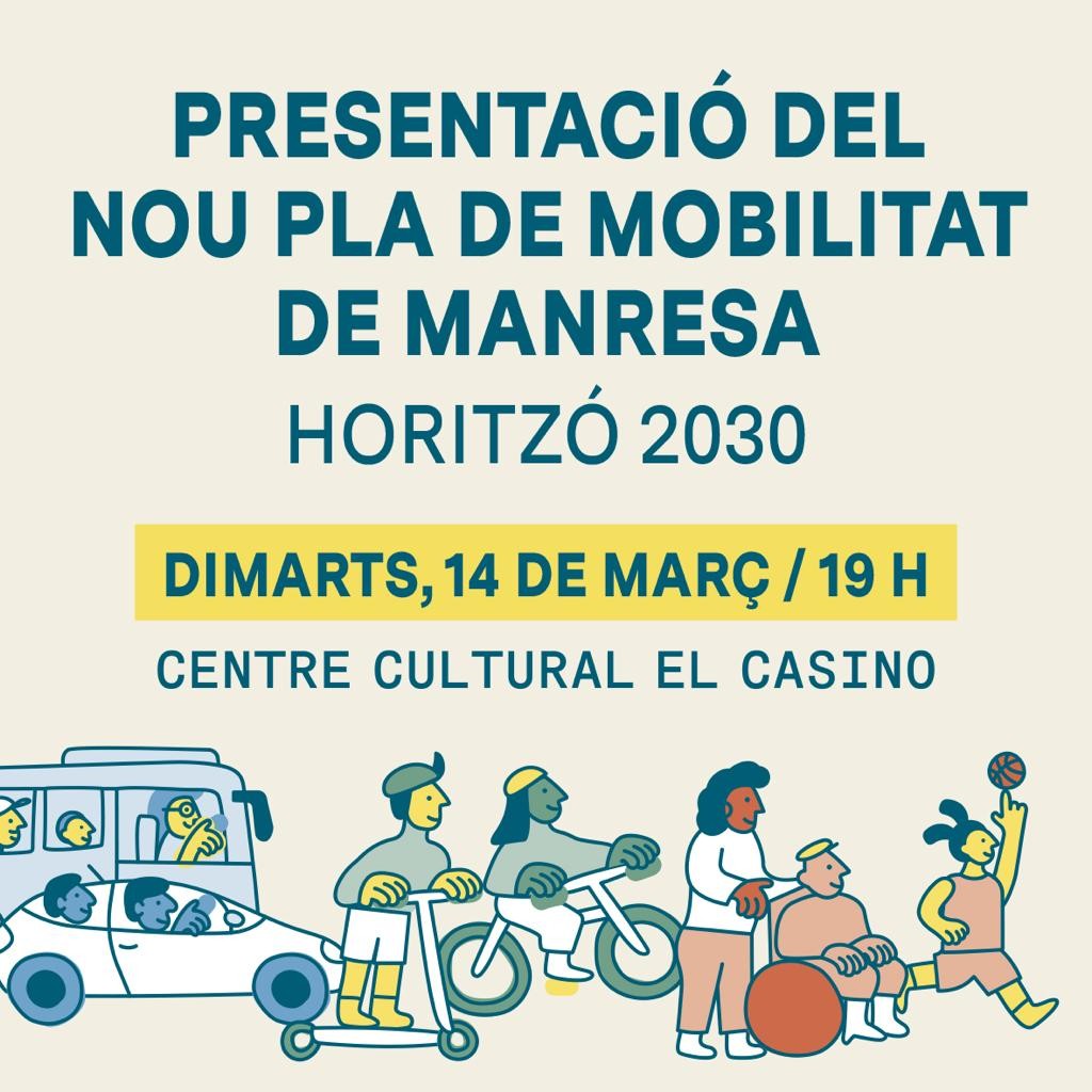 L’Ajuntament de Manresa presentarà aquest dimarts, 14 de març, en un acte obert a la ciutadania, el nou Pla de Mobilitat Urbana Sostenible (PMUS), que es portarà a aprovació inicial al Ple Municipal d’aquest mes de març i que compta amb el suport majoritari dels grups municipals. L’acte de presentació tindrà lloc a les 19 h al Centre Cultural El Casino i anirà a càrrec de l’alcalde de Manresa, Marc Aloy Guàrdia, i del regidor d’Urbanisme i Mobilitat, David Aaron López Martín.