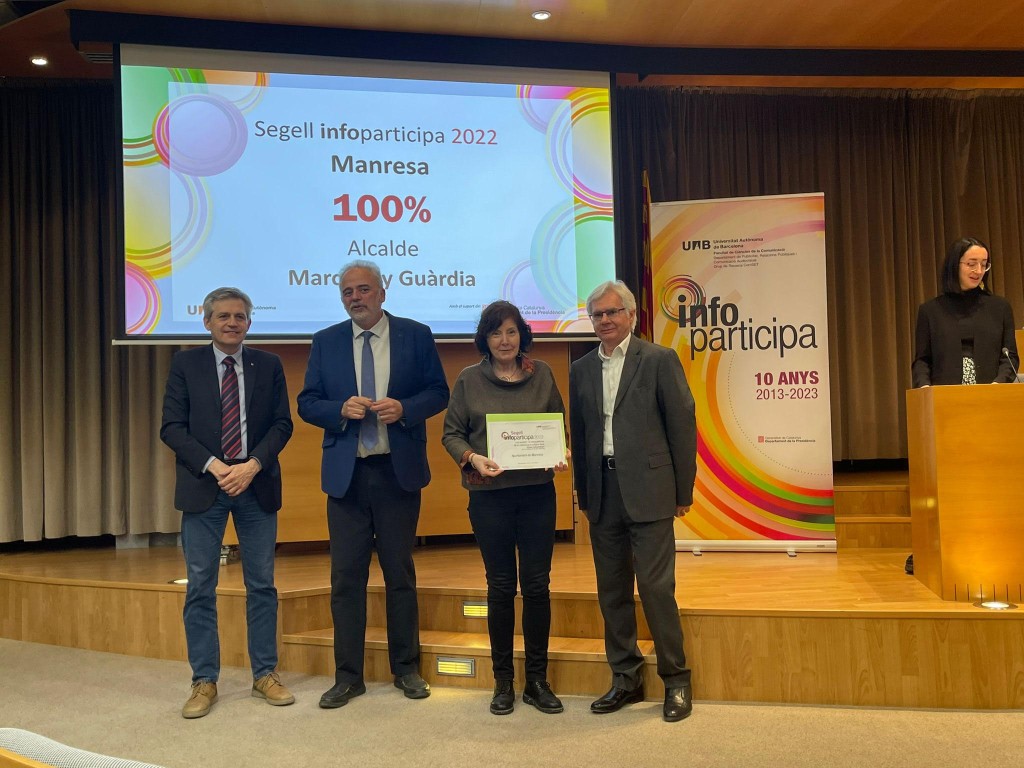L’Ajuntament de Manresa ha aconseguit, per novè any consecutiu, el màxim nivell de transparència, el 100%. Així ho acredita l’obtenció del Segell Infoparticipa, un guardó atorgat pel grup de recerca Comunicació Sonora, Estratègica i Transparència (ComSET) de la Universitat Autònoma de Barcelona (UAB), que reconeix la transparència informativa de les webs de les institucions.