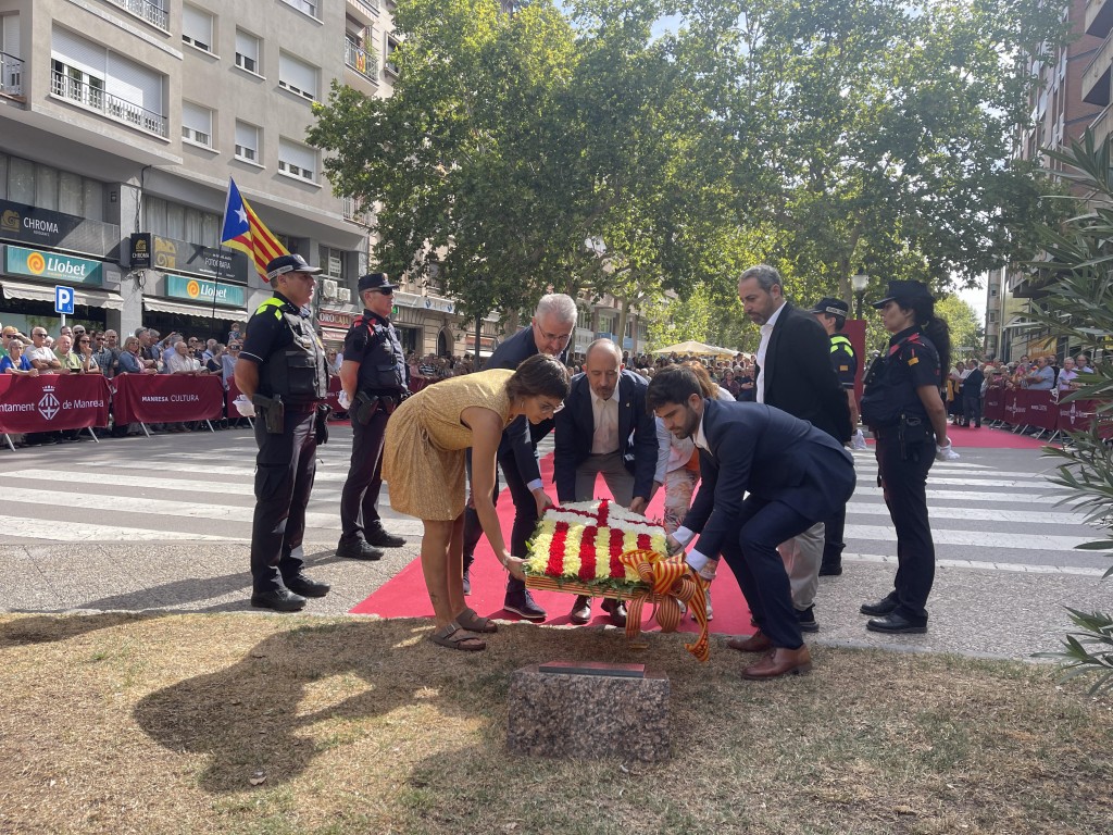 Després del discurs de l’alcalde, ha tingut lloc l’ofrena floral de l’Ajuntament de Manresa, encapçalada pel mateix alcalde i amb els representants dels grups municipals d’ERC, Impulsem, Junts, Fem Manresa i FNC. Posteriorment, ha estat el torn de la Delegació del Govern a la Catalunya Central i del Consell Comarcal del Bages.