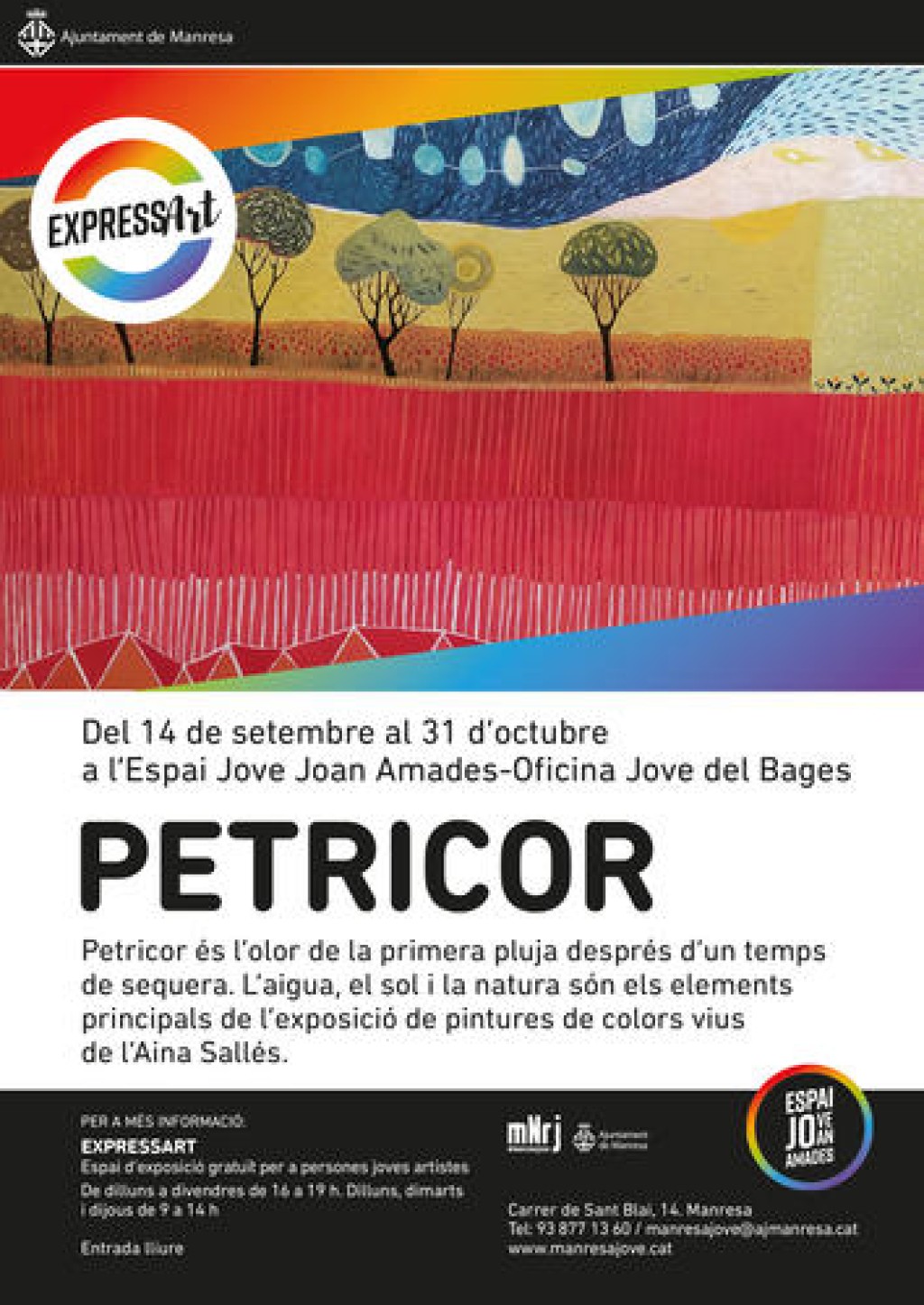 A partir d’avui es pot visitar a l’Espai Jove Joan Amades l'exposició de pintura ‘Petricor’, de la jove artista Aina Sallés Perramon. Petricor és l’olor de la primera pluja després d’un temps de sequera. L’aigua, el sol i la natura són els elements principals de l’exposició de colors vius que proposa l’artista.