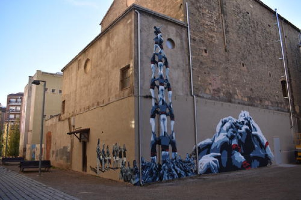 El disseny del mural vol representar els tres elements fonamentals de l’activitat castellera: la pinya, el castell i els músics. La imatge s’inspira en la dedicació, la història i la força col·lectiva que caracteritza els castellers. Prèviament a la intervenció artística, s’han fet millores en la superfície de les parets i en les canalitzacions de recollida d’aigües pluvials de l’edifici.