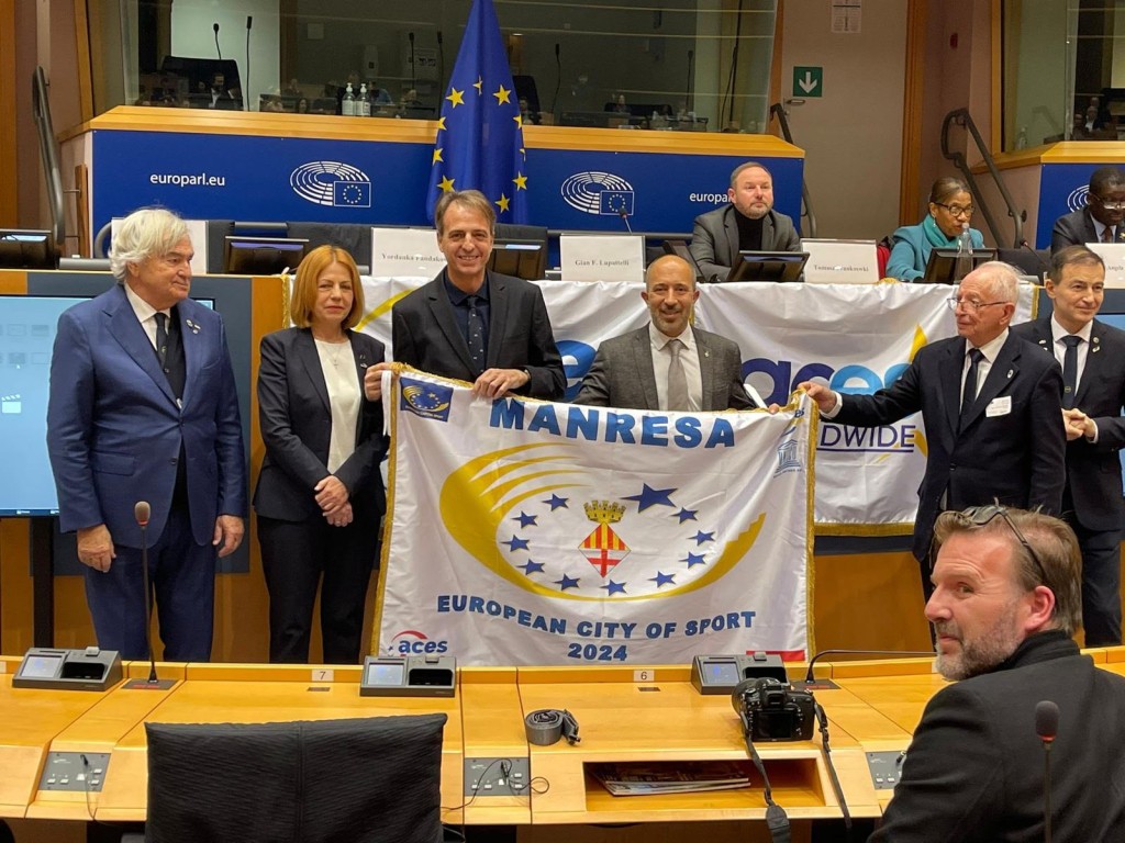 Manresa ha rebut aquest dijous a Brussel·les la bandera que l’acredita com a Ciutat Europea de l’Esport 2024, en una gala que s’ha celebrat al Parlament Europeu que ha comptat amb la presència de l’alcalde de Manresa, Marc Aloy Guàrdia, i del regidor d’Esports, Anjo Valentí Moll. Amb l’entrega del guardó, l’Associació de Capitals i Ciutats Europees de l’Esport (Aces Europe) ha fet oficial la distinció, que reconeix a la ciutat de Manresa el seu bagatge en la promoció de la salut i l’esport i que permetrà a la ciutat desplegar durant el 2024 un ampli programa de foment de l’activitat física.