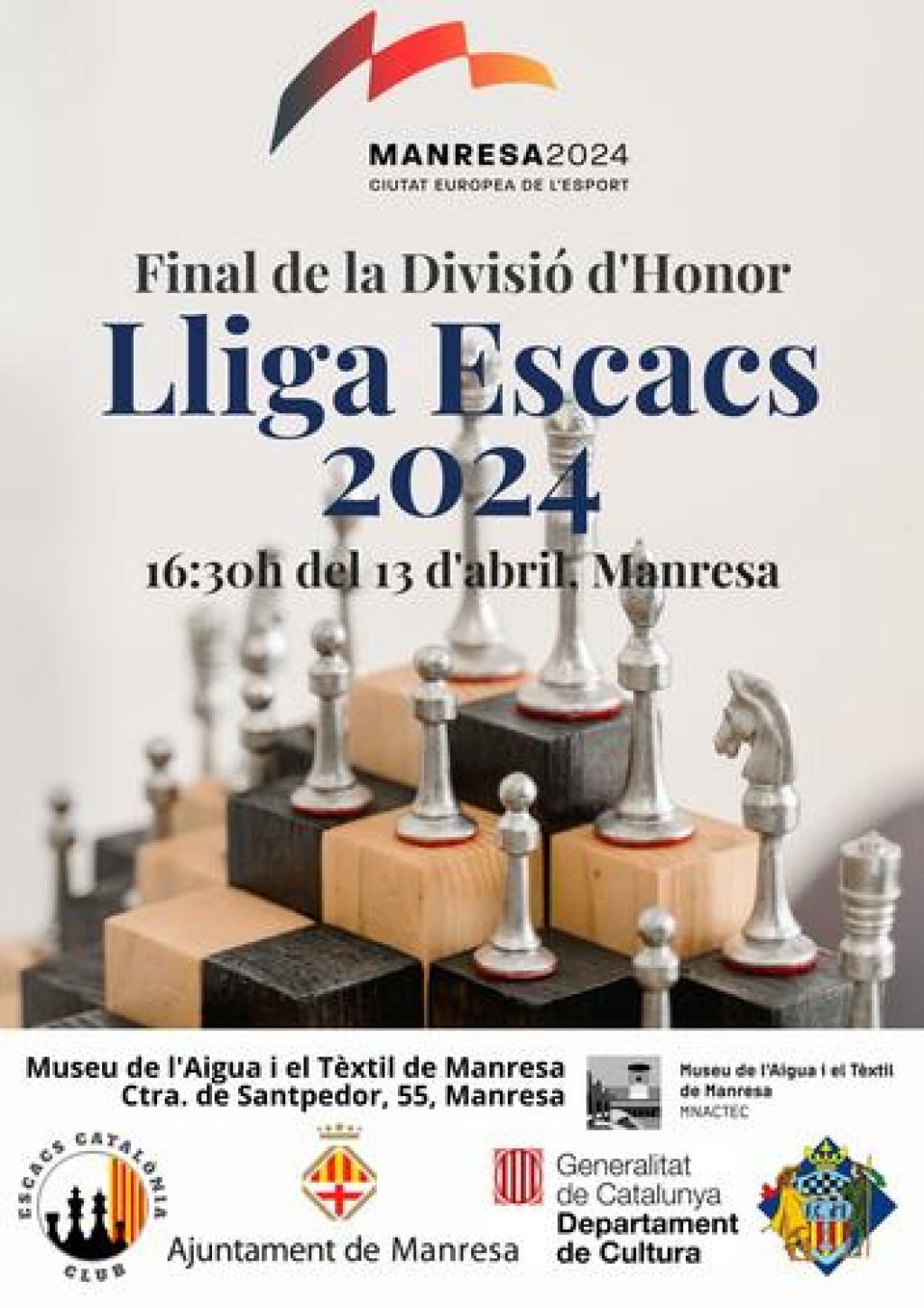 Manresa serà aquest dissabte, 13 d’abril, la capital de l’esport dels escacs de Catalunya. Tot està a punt per a la celebració a les instal·lacions del Museu de l’Aigua i el Tèxtil de la Final de la Divisió de la Lliga Catalana d’Escacs, un esdeveniment que forma part de la programació de Manresa, Ciutat Europea de l’Esport 2024.