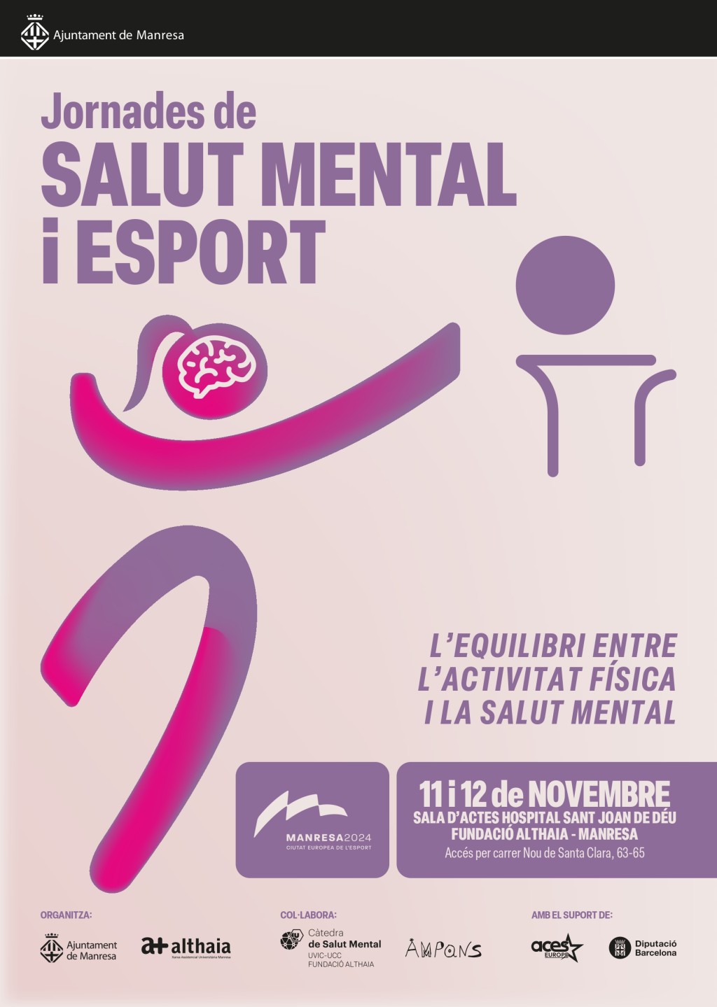 La relació entre salut mental i pràctica esportiva centrarà unes jornades que tindran lloc a Manresa els propers dies 11 i 12 de novembre, organitzades per l’Ajuntament de Manresa i la Fundació Althaia amb la col·laboració de la Càtedra de Salut Mental de la UVic-UCC i Althaia. Les jornades, que estan emmarcades en el programa d’actes de Manresa Ciutat Europea de l’Esport 2024, posaran sobre la taula diferents qüestions relatives a la salut mental al món de l’esport: des de l’impacte de l’esport d’alt nivell en la salut mental dels esportistes fins al paper que té l’esport a l’hora d’aconseguir una bona salut mental.