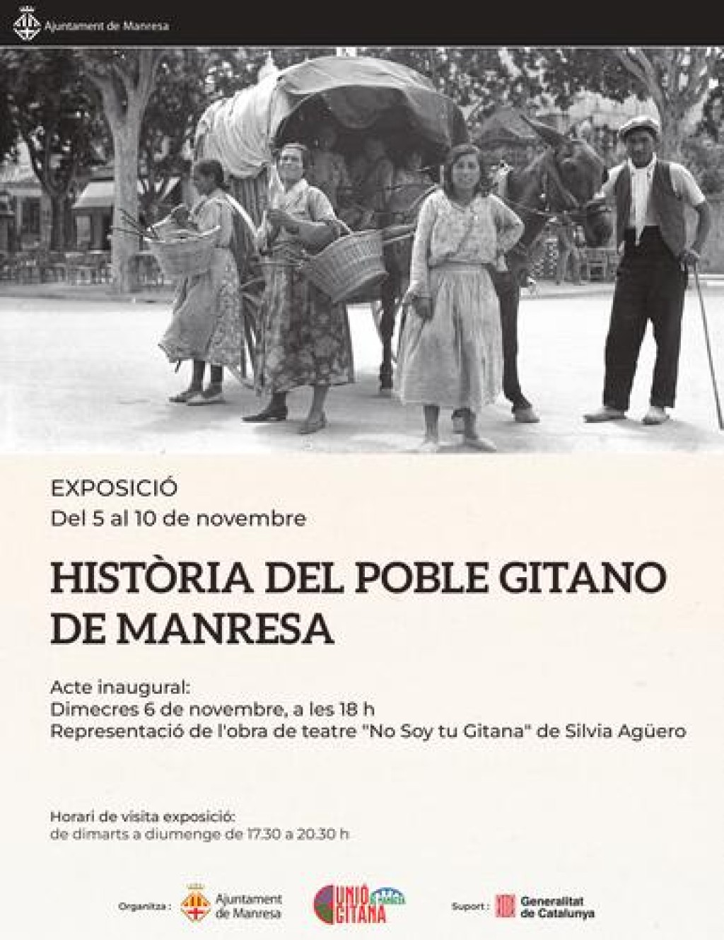 Després de la presentació de l’exposició, es representarà l’obra “No soy tu gitana”, un monòleg que desmunta la imatge pública que històricament s’ha tingut de les dones gitanes. Posteriorment, es portarà a terme un col·loqui amb l’actriu protagonista de l’obra, Silvia Agüero Fernández, Joan Garcia Jiménez, president de l’Associació Unió Gitana de Manresa i Aaron Giménez Cortés, també membre de l’associació. L’acte està organitzat per l’Ajuntament de Manresa amb la col·laboració del departament d’Igualtat i Feminisme de la Generalitat de Catalunya. L’assistència a la inauguració i a la representació és gratuïta però cal inscriure’s de forma prèvia en aquest enllaç.