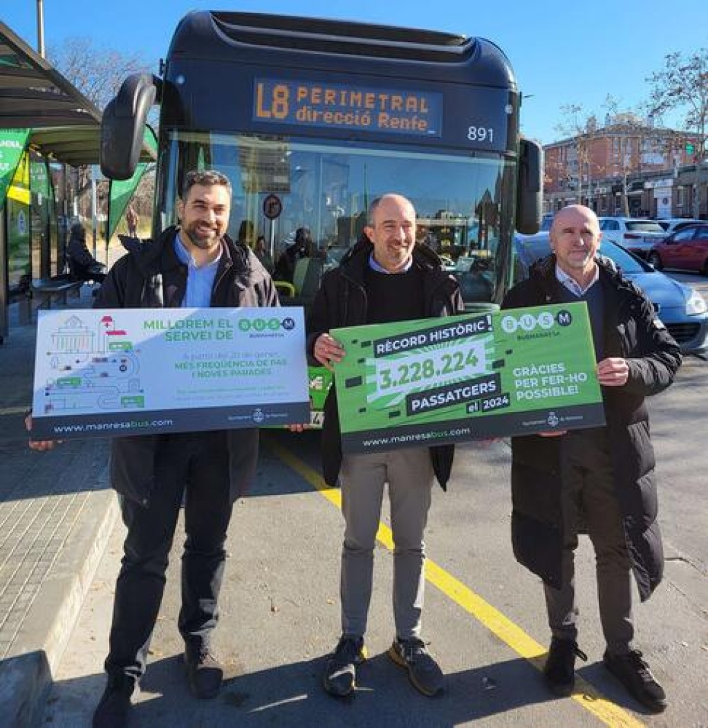 El bus urbà de Manresa ha trencat per segon any consecutiu, aquest 2024, tots els rècords de viatgers assolits fins ara i per primer cop ha superat la barrera dels tres milions de passatgers. En concret, el bus urbà ha transportat en un any la xifra rècord de 3.228.224 persones. L’increment és del 12,2%, amb un total de 349.577 usuaris més que el 2023. La mitjana diària d’usuaris en dies feiners és d’11.477 viatgers, tot i que al novembre va ser de 12.332 persones. El nombre màxim de viatgers diaris es va assolir el 22 d’octubre, amb 14.645 persones.