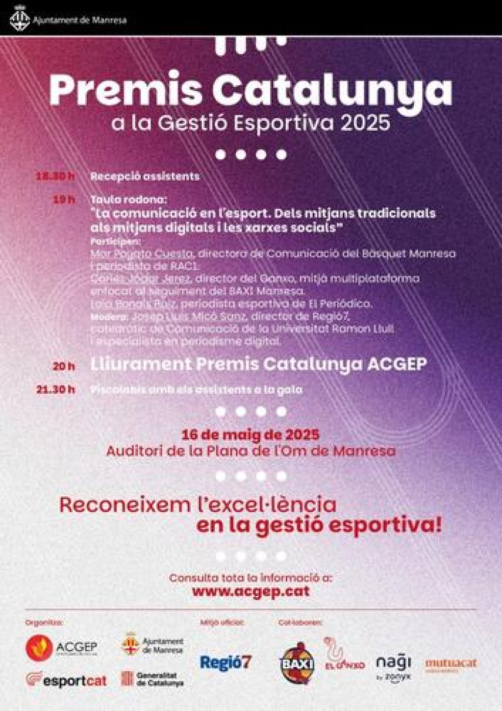 Manresa serà l'escenari, aquest divendres, de la 9a edició dels Premis Catalunya a la Gestió Esportiva, que tindrà lloc a l'Auditori Plana de l'Om. L'esdeveniment és organitzat per l'Associació Catalana de Gestors Esportius Professionals (ACGEP) amb el suport de l'Ajuntament de Manresa. Aquesta cita ret homenatge a professionals i entitats que han destacat en la millora i desenvolupament de la gestió esportiva a Catalunya.