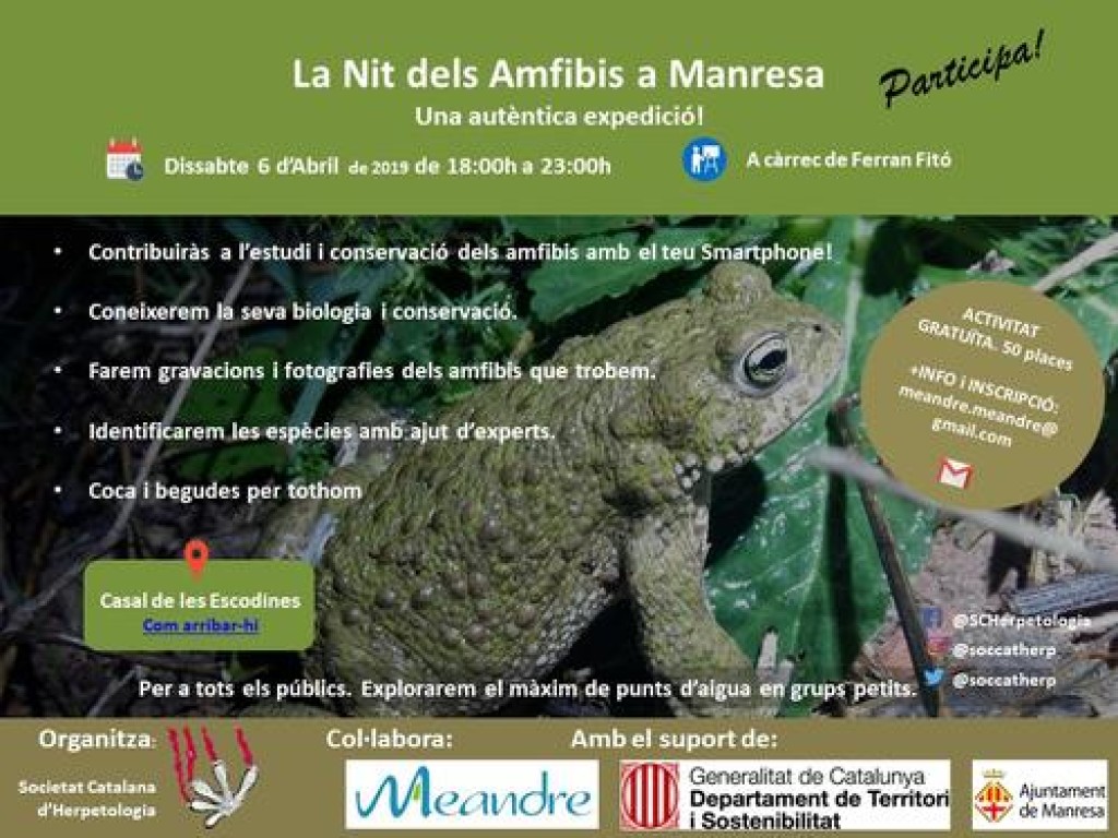 La capital del Bages viurà una nova experiència aquest dissabte 6 d’abril, la Nit dels Amfibis, una jornada participativa, gratuïta i adreçada a tots els públics. L’objectiu és inventariar i identificar els diferents amfibis que es troben dins del terme municipal de Manresa.