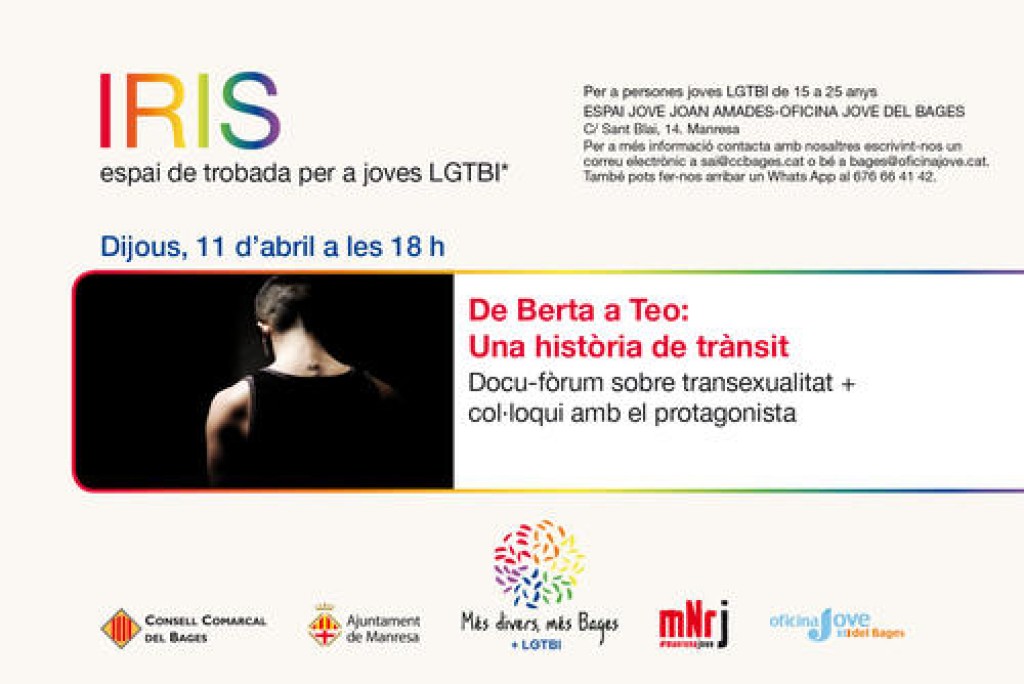 El proper dijous 11 d’abril tindrà lloc la segona jornada d’Iris, el nou punt de trobada destinat al jovent LGTBI, organitzat pels SAIS del Consell Comarcal del Bages i de l’Ajuntament de Manresa i per l’Oficina Jove del Bages. A les 6 de la tarda s’obriran les portes de l’Espai Jove Joan Amades (c/Sant Blai, núm.14) per compartir una tarda de documental de temàtica trans.