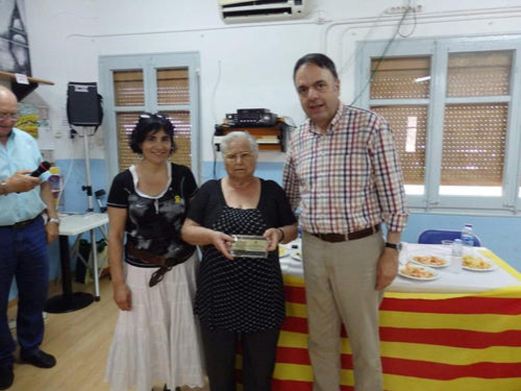 08/07/2019Valentí Junyent, acompanyat de la regidora d’Infància, Joventut i Persones Grans, Rosa M. Ortega, ha lliurat un record al les dues persones de més edat del barri, Amparo Antequera i José López.