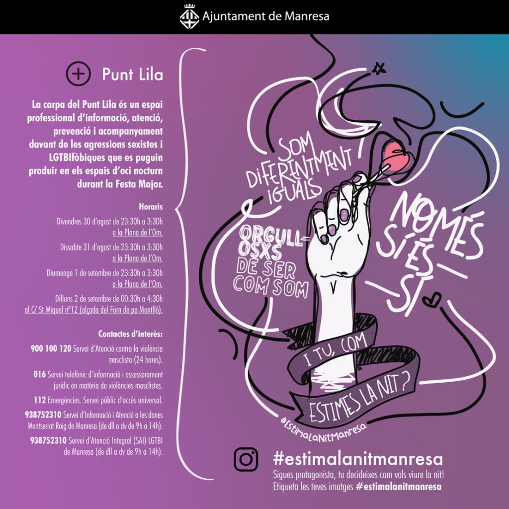 28/08/2019La campanya #estimalanitmanresa contra les agressions sexistes i el consum responsable d’alcohol desplegarà a partir de demà les principals accions previstes, principalment amb la tasca de difusió del Punt Lila i els Àngels de Nit. La campanya es perllongarà totes les nits del cap de setmana i dilluns, a la plana de l’Om i carrer Sant Miquel de Manresa.