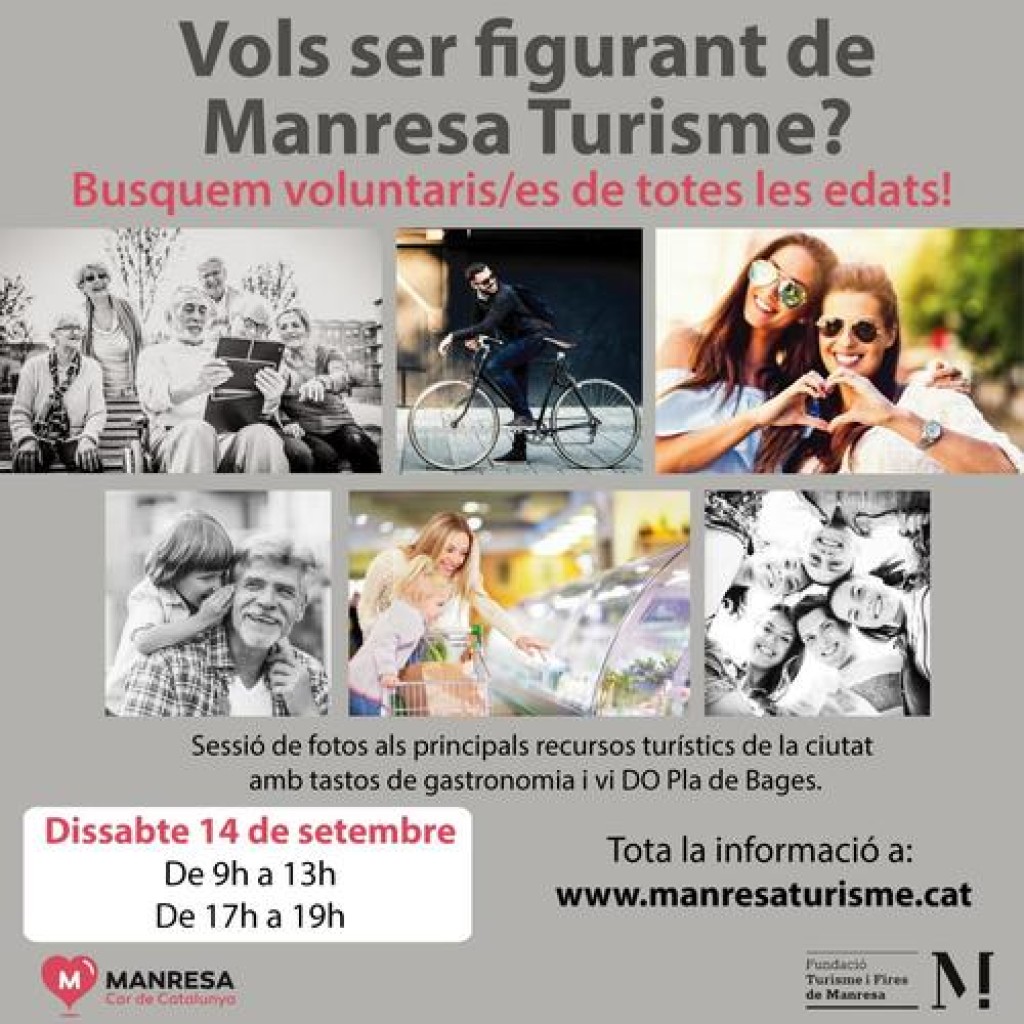 La Fundació Turisme i Fires de Manresa busca voluntaris/es per a fer de figurants en una sessió de fotos als principals espais turístics de Manresa per al dissabte 14 de setembre. Aquestes fotografies es faran servir en materials de difusió i publicitat i en imatges de promoció elaborats per Manresa Turisme. Si les condicions meteorològiques no són favorables, la sessió s'ajornarà al 21 de setembre.