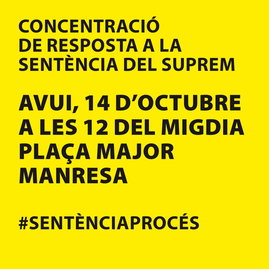 Avui, a les 12 del migdia, a la plaça Major de Manresa, tindrà lloc una concentració de rebuig a la sentència del Tribunal Suprem, feta pública aquest matí.
