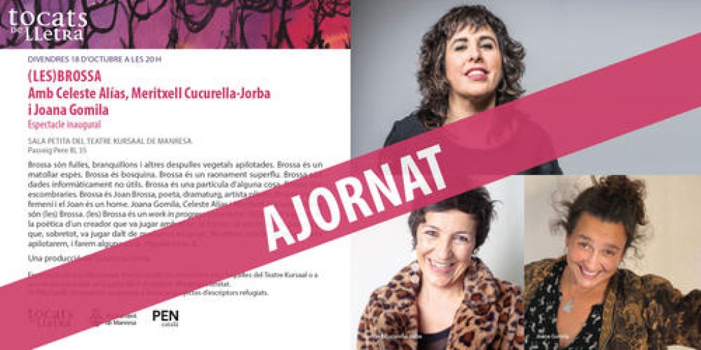 L’espectacle d’obertura de la 13a edició del Tocats de Lletra, “(Les) Borssa, que havia de tenir lloc demà, dijous 18 d’octubre, a la Sala Petita del Teatre Kursaal, s’ajorna per la vaga convocada contra la sentència del Suprem. El recital, a càrrec de Celeste Alías, Meritxell Cucurella-Jorba i Joana Gomila, es posposa fins a nova data que es comunicarà en els pròxims dies.