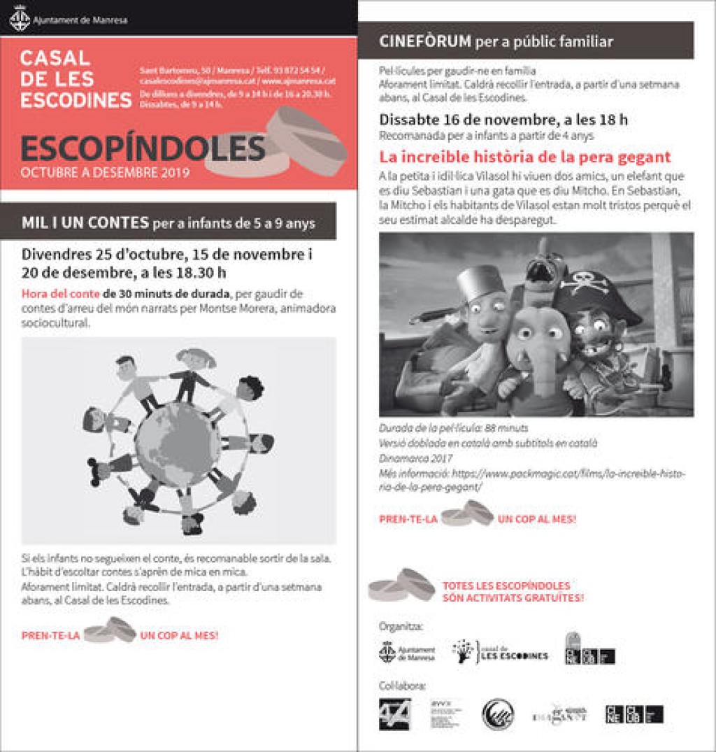 23/10/2019La nova programació d’Escopíndoles, adreçada al públic infantil i familiar, inclou tres sessions de narracions de contes (els divendres, 25 d’octubre, 15 de novembre, i 20 de desembre) i el cinefòrum “La increïble història de la pera gegant” (dissabte 16 de novembre).