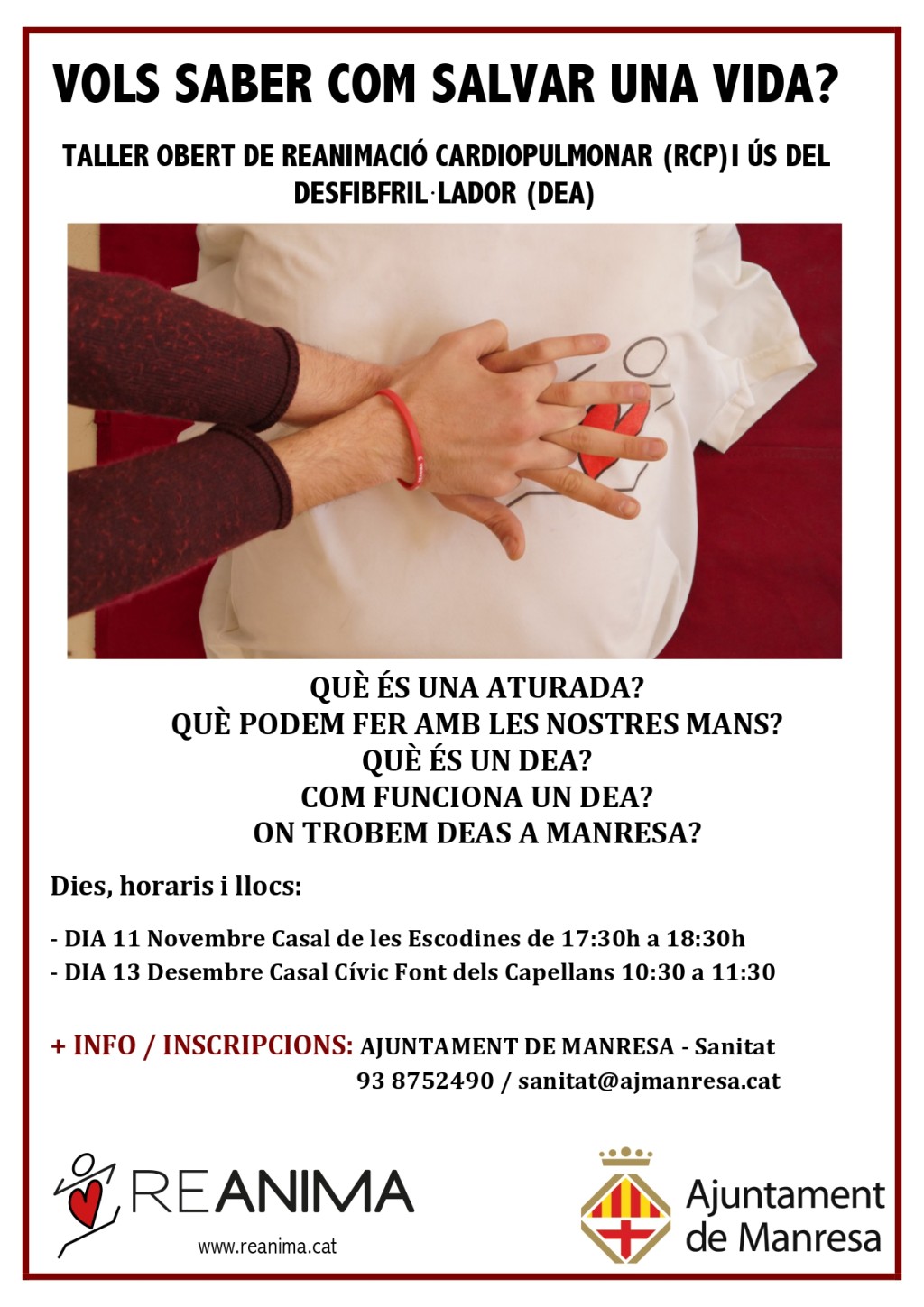 En el marc del projecte “Manresa, ciutat cardioprotegida”, l’Ajuntament oferirà dos tallers sobre reanimació cardiopulmonar i l’ús de desfribil·lador. El primer serà el dia 11 de novembre, a 2/4 de 6 de la tarda, al Casal de les Escodines, i el segon taller programat tindrà lloc el 13 de desembre a 2/4 d’11 del matí. Ambdós cursos tindran una durada d’una hora. Per a participar-hi cal fer una inscripció prèvia trucant al telèfon del departament de Sanitat de l’Ajuntament de Manresa, al 938752490, o bé enviar un correu electrònic a l’adreça sanitat@ajmanresa.cat.