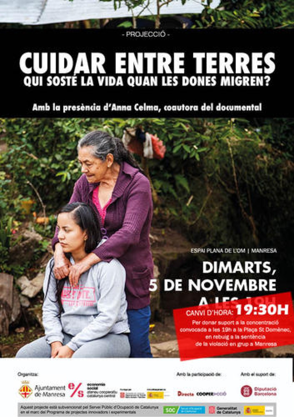 L’Espai Plana de l’Om de Manresa, a les 19.30 h, acollirà la projecció del documental “Cuidar entre terres. Qui sosté la vida, quan les dones migren”. L’acte comptarà amb l’assistència d’Anna Celma, coautora del documental. La projecció està organitzada per l’Ateneu Cooperatiu de la Catalunya Central i l’Ajuntament de Manresa en el marc del projecte “Llar i cures, feines dignes”.