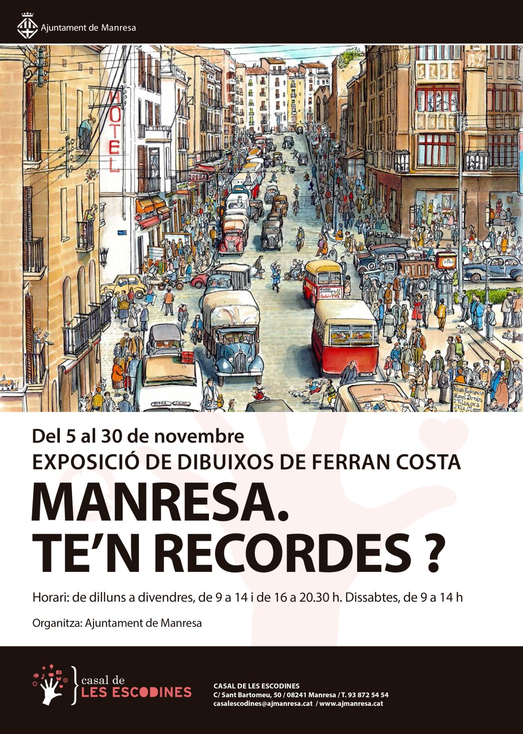 Una divertida exposició de l’il·lustrador autodidacte Ferran Costa i Duran (Manresa, 1954), amb el títol “Manresa. Te’n recordes? es podrà visitar al Casal de les Escodines a partir de demà, dia 5, i fins al 30 de novembre. Es tracta de nou plafons de gran format fets amb llapis, aquarel·la i tinta, que recullen imatges d’espais emblemàtics de la Manresa de l’entorn dels anys 60.