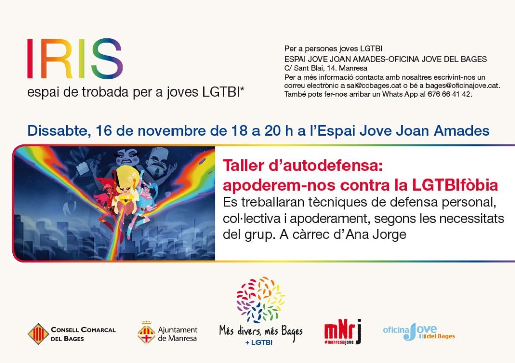 L’Oficina Jove del Bages (carrer Sant Blai, 14) acollirà la sisena sessió d’IRIS, l’espai per a joves LGTBI+ de Manresa i el Bages, el dissabte 16 de novembre a les 6 de la tarda. L’activitat consistirà en un taller d’autodefensa centrat a treballar estratègies tant a nivell personal com col·lectiu per combatre les situacions de discriminació a què en molts casos les persones LGTBI+ afronten, com a conseqüència de la diversitat afectiva, sexual i de gènere “no normativa”. El taller, anomenat d’autodefensa contra la LGTBIfòbia, anirà a càrrec d’Ana Jorge, dinamitzadora de tallers d’autodefensa feminista i en tècniques d’autodefensa.