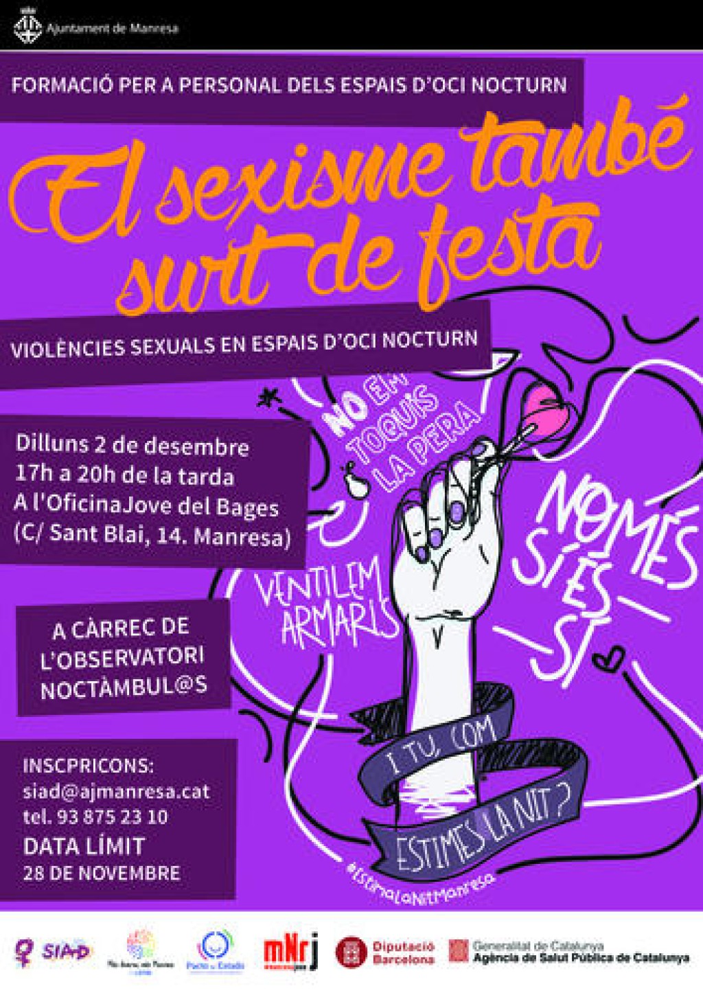 En el marc del projecte “Estima la Nit” contra les agressions sexistes en espais d’oci nocturn, el Servei d’Informació i Atenció a la Dona (SIAD) Montserrat Roig de l’Ajuntament de Manresa organitza una sessió de formació per a personal que treballa en els espais d’oci nocturn de Manresa, per tal d’aprofundir en el coneixement de la detecció de la violència masclista en els espais de lleure i de l’oci nocturn, així com conèixer estratègies de prevenció d’aquestes violències i protocols d’actuacions per fer-hi front.