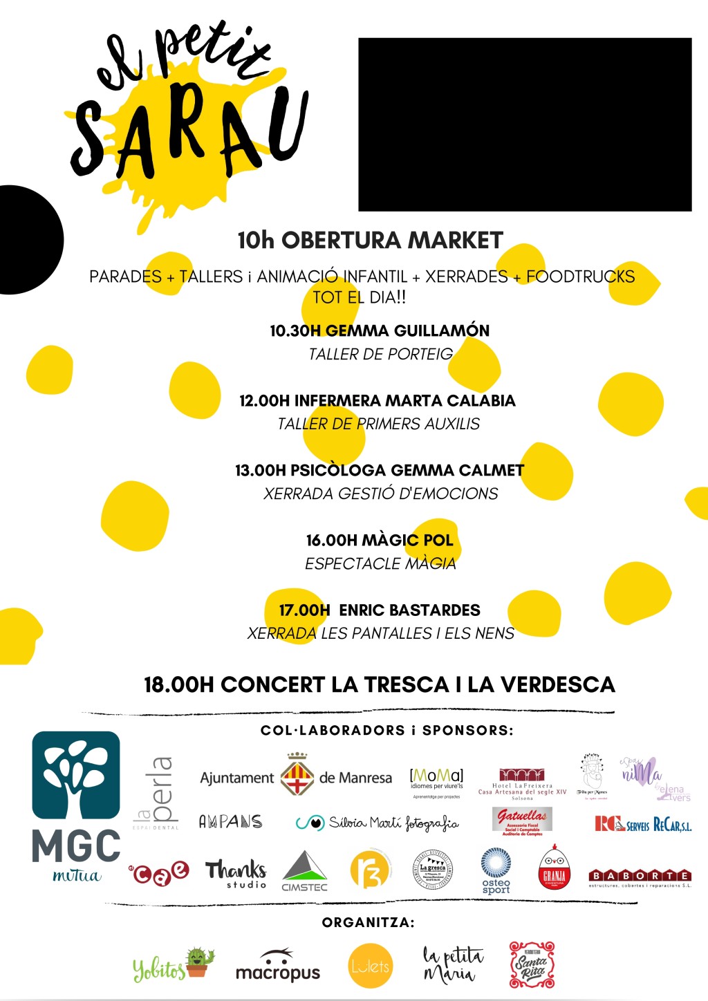 26/11/2019Parades, tallers, xerrades, jocs i animació infantil seran els ingredients de El Petit Sarau, que tindrà lloc a la fàbrica de l’Anònima aquest dissabte, 30 de novembre, a partir de les 10 del matí i fins a les 8 del vespre. El Petit Sarau està organitzat per cinc mares manresanes i emprenedores i té el suport de l’Ajuntament de Manresa.