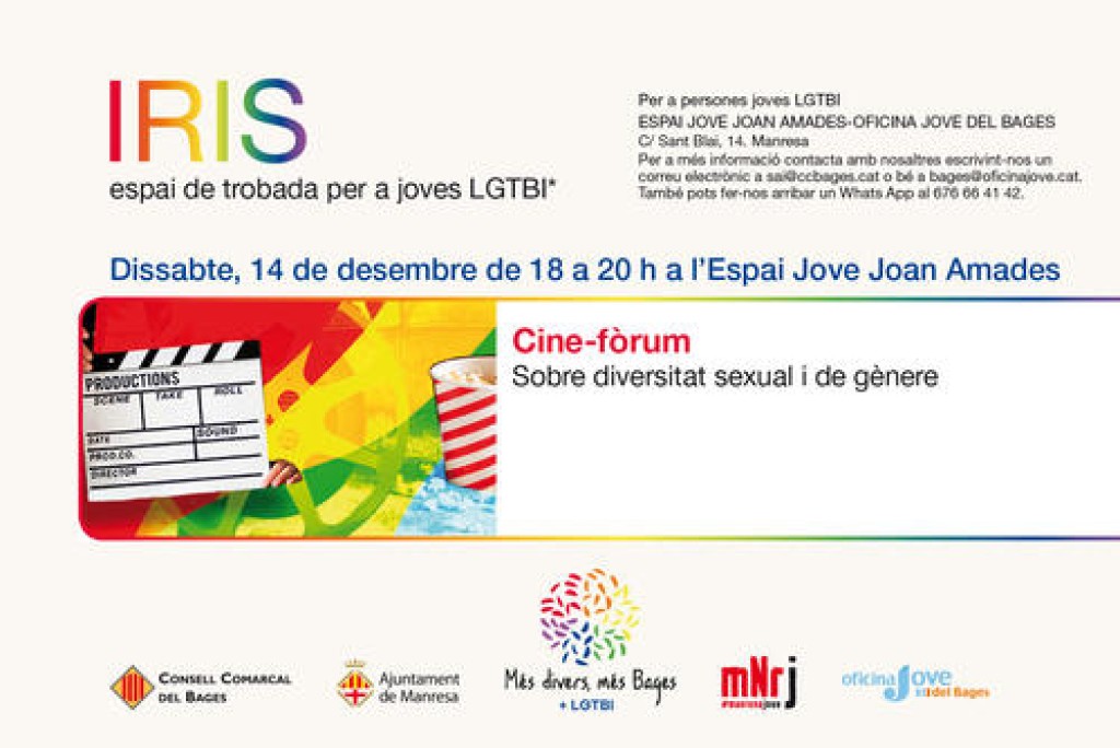 El proper dissabte, 14 de desembre, tindrà lloc la setena jornada d’Iris, el punt de trobada destinat al jovent LGTBI del Bages, organitzat pels SAI del Consell Comarcal del Bages i de l’Ajuntament de Manresa i per l’Oficina Jove del Bages. A les 6 de la tarda s’obriran les portes de l’Espai Jove Joan Amades (c/Sant Blai, núm.14) per compartir una tarda de documental de temàtica LGTBI+.