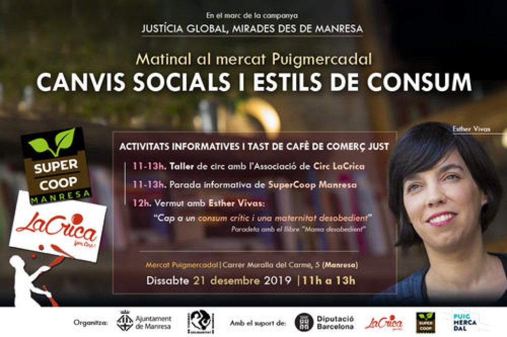 19/12/2019Tindrà lloc a l’Espai Degustació del Mercat Puigmercadal de les 11 del matí a la 1 del migdia i comptarà amb la participació de la cooperativa Supercoop i la Botiga de Comerç Just. La matinal inclourà una xerrada-vermut amb Esther Vivas, i a més, hi haurà un espai de circ per a infants amb LaCrica.