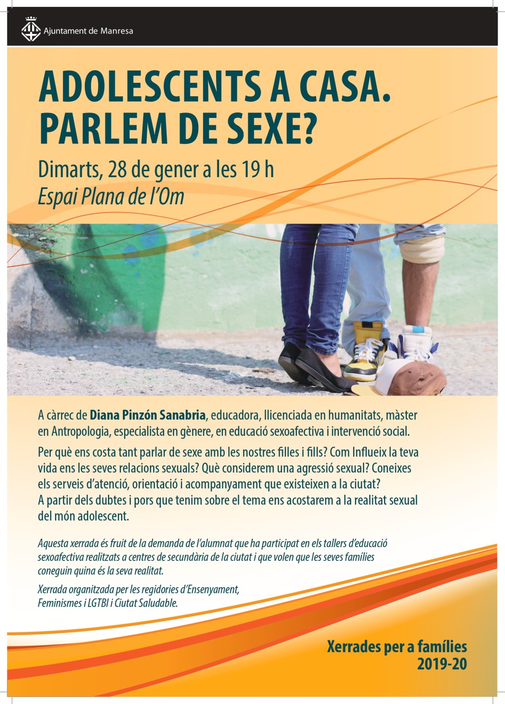Aquesta xerrada, organitzada per les regidories d’Ensenyament, Feminismes i LGTBI i Ciutat Saludable de l’Ajuntament de Manresa és fruit de la demanda de l’alumnat que ha participat en els tallers d’educació sexoafectiva realitzats als centres de secundària de la ciutat i que volen que les seves famílies coneguin quina és la seva realitat envers aquest tema.